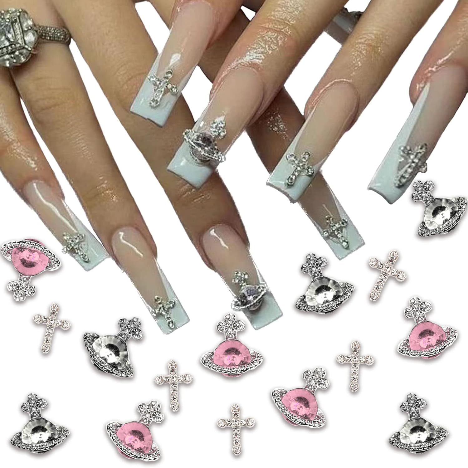 25 PCS Planet Nail Art Charms White Pink 3D Cross Nail Art Supplies with Rhinestones Saturn Shape Design Nail Gems Shiny Nail Jewelry Acrylic Accessories for Women Nail Decorations
