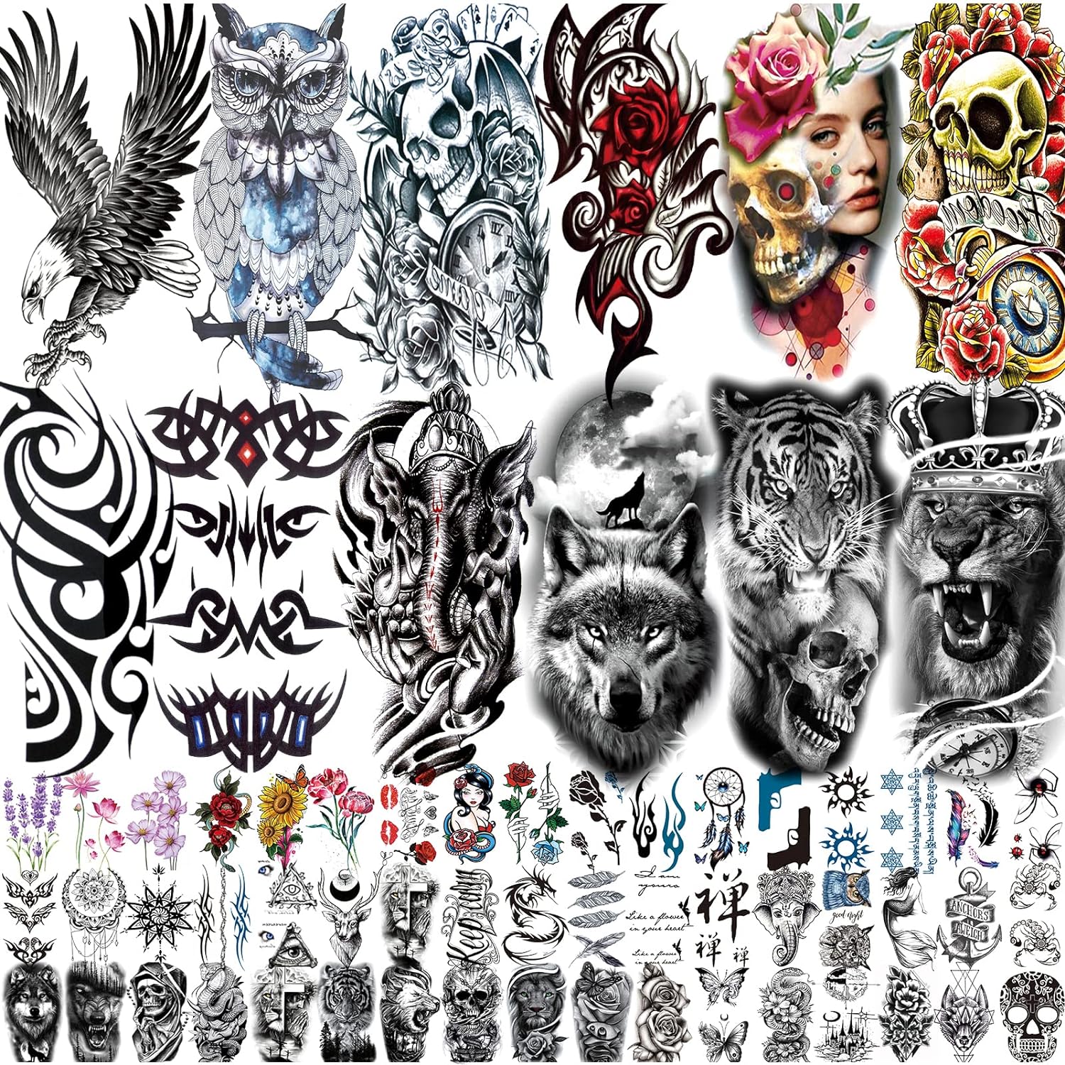 80 Sheets Temporary Tattoos Stickers, Fake Body Arm Chest Shoulder Tattoos for Men and Women, Halloween Temporary Tattoos Black Fake Skull Skeleton Tattoos for Halloween Cosplay