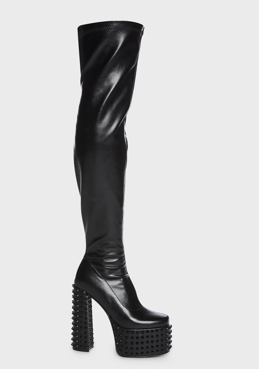 cuz you stay ready. These thigh high platform boots have a stretch vegan leather construction, chunky block heels, studded hardware, and side zip closures.