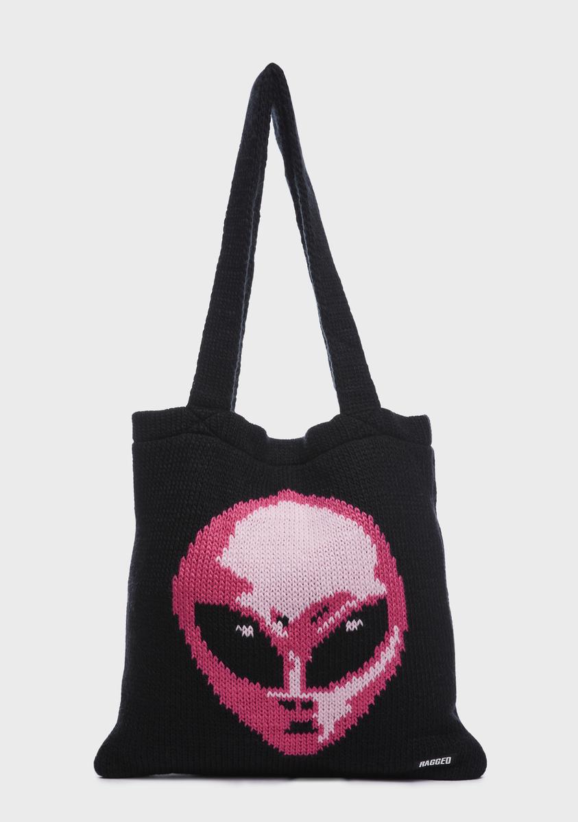 cuz we are not alone. This tote bag has a soft knitted outer, an alien printed at front, a branded rubber logo, and a magnetic closure.