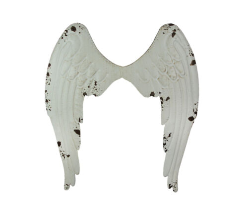 Give your home a heartwarming focal point by hanging this wonderful angel wings sculpture on your wall. You can display it indoors, or hang it on a garden fence or an exterior wall, and if you don't want to hang it up, you can let it lean against the wall from any table or shelf. It's made of stamped metal that gives it a feathery texture, and the antiqued white finish is faux-aged on the edges to give it an aged look. This wall sculpture will add a sense of peace to any room.