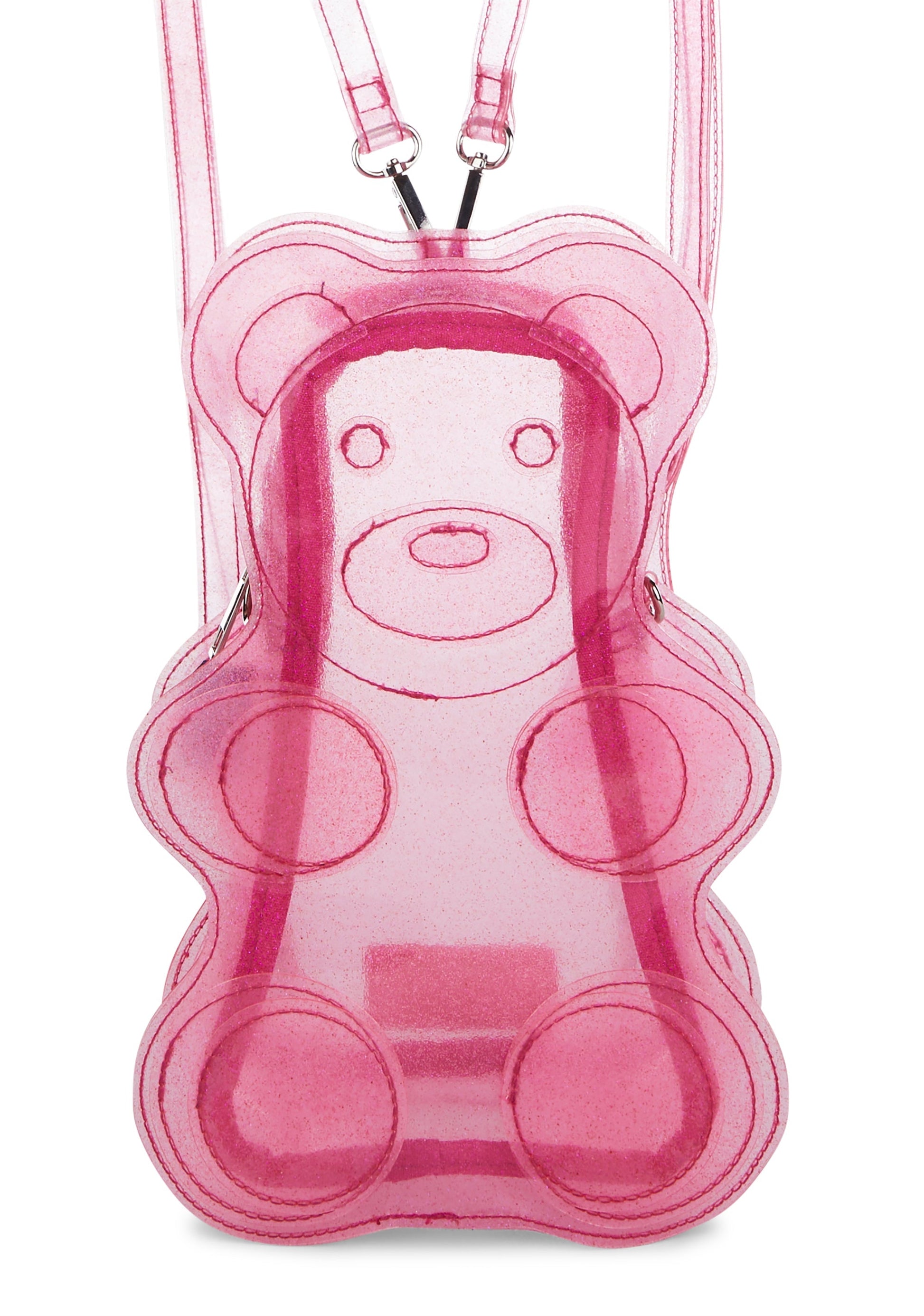 cuz you're the sweetest treat! This mini gummy bear backpack has a clear jelly vinyl construction with glitter all over, a top zip closure, and adjustable shoulder straps that can also be detached and worn as a crossbody.