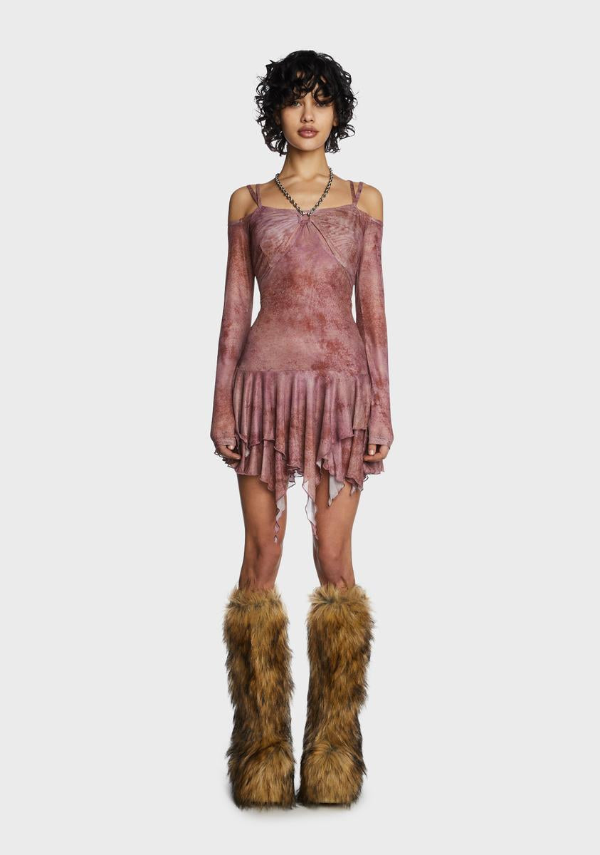 cuz you just wanna be a fairy. This bardot mini dress has a double layered mesh construction, off the shoulder long sleeves, an asymmetrical ruffle skirt, and a chain halter neck detail.