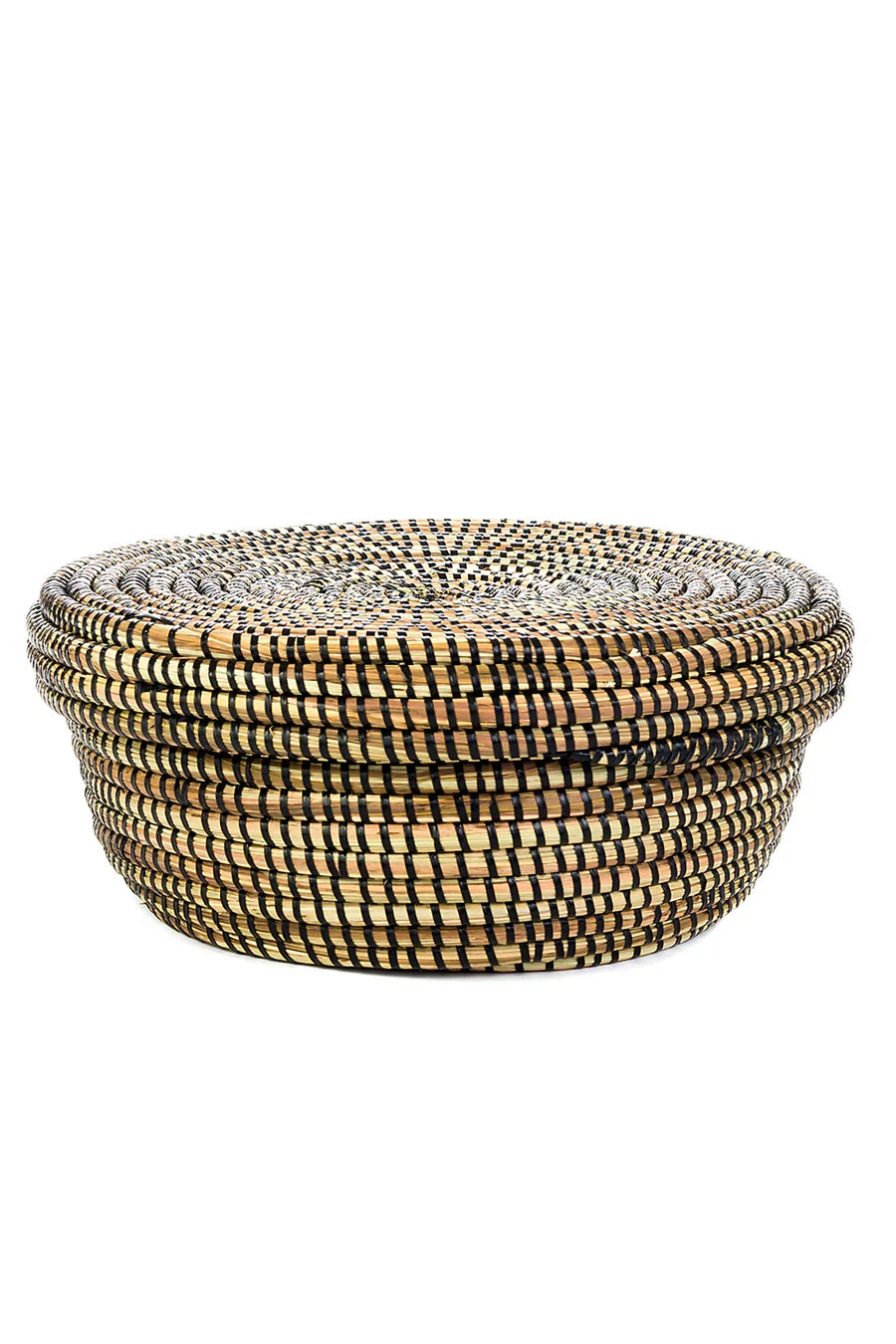 Wolof women in Senegal weave this colorful storage container by binding cattail stalks with colorful strips of plastic purchased as salvaged end cuts at a mat factory in Dakar.