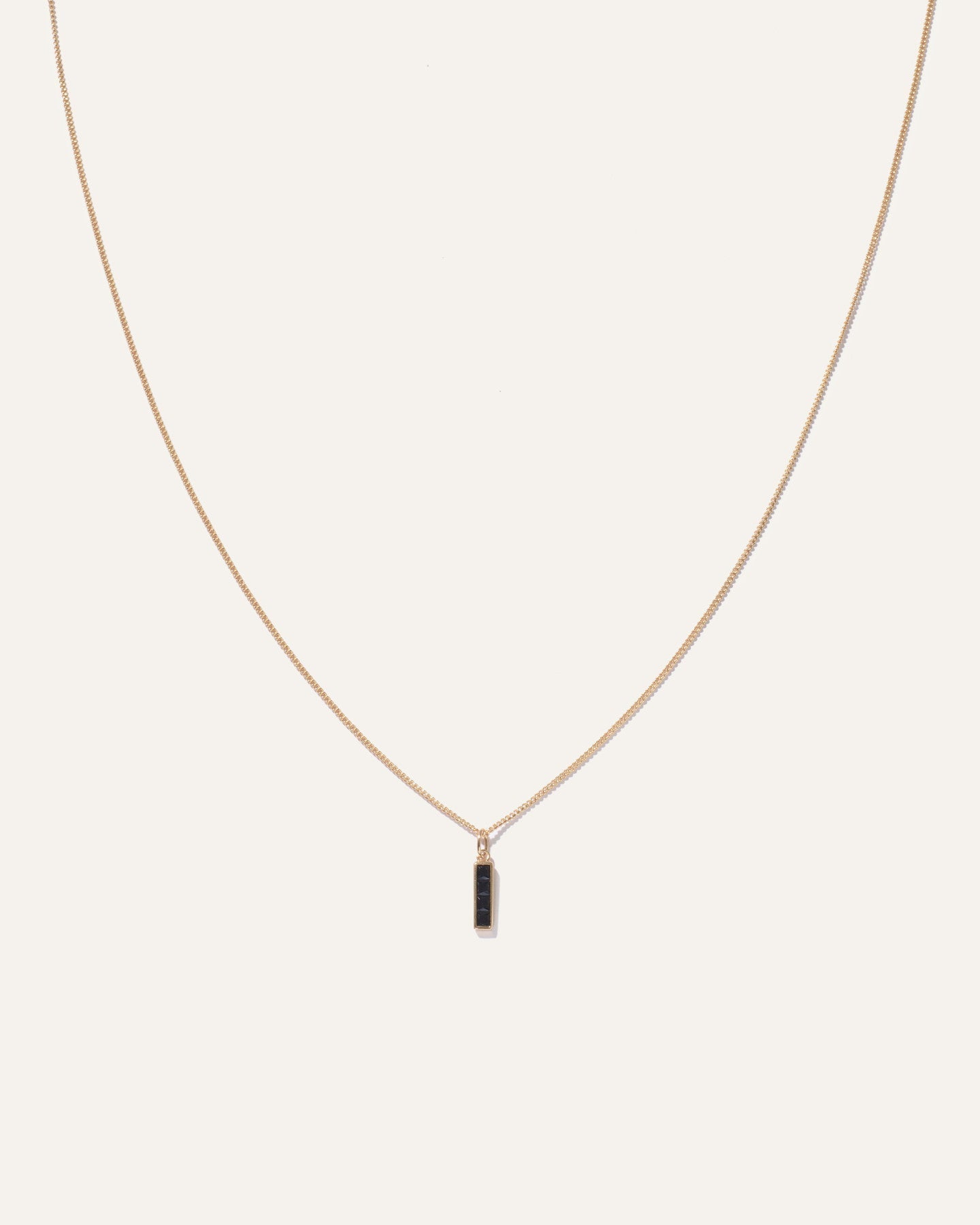 Our Vertical Bar Pendant Necklace features four black spinel stones, known for their deep black color and brilliant sparkle. A special addition to any outfit, day or night.