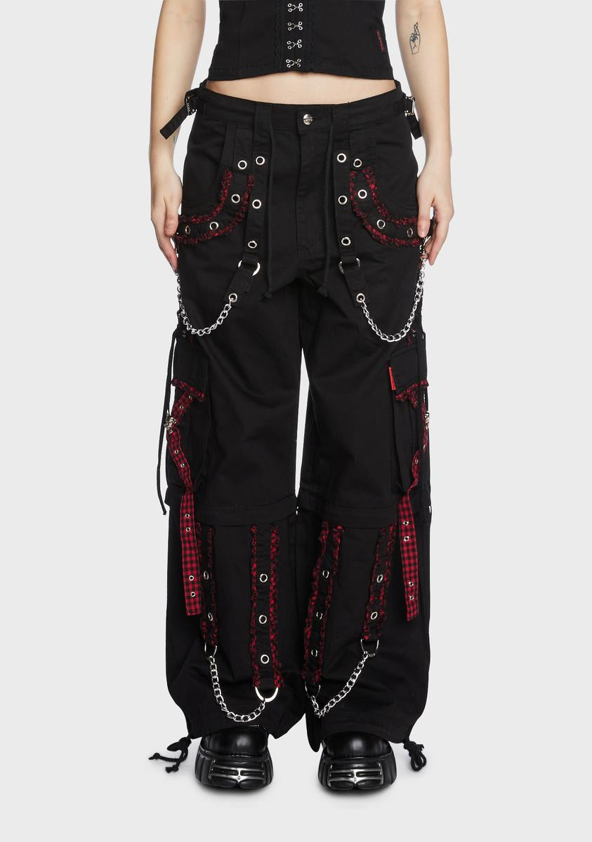 eat, sleep, rage, repeat! These baggy low-rise pants have gingham print trim and straps, a drawstring waistline with a button closure, grommet, zipper, and D-ring hardware and removable chains, deep flap pockets, and zip-off detachable legs.