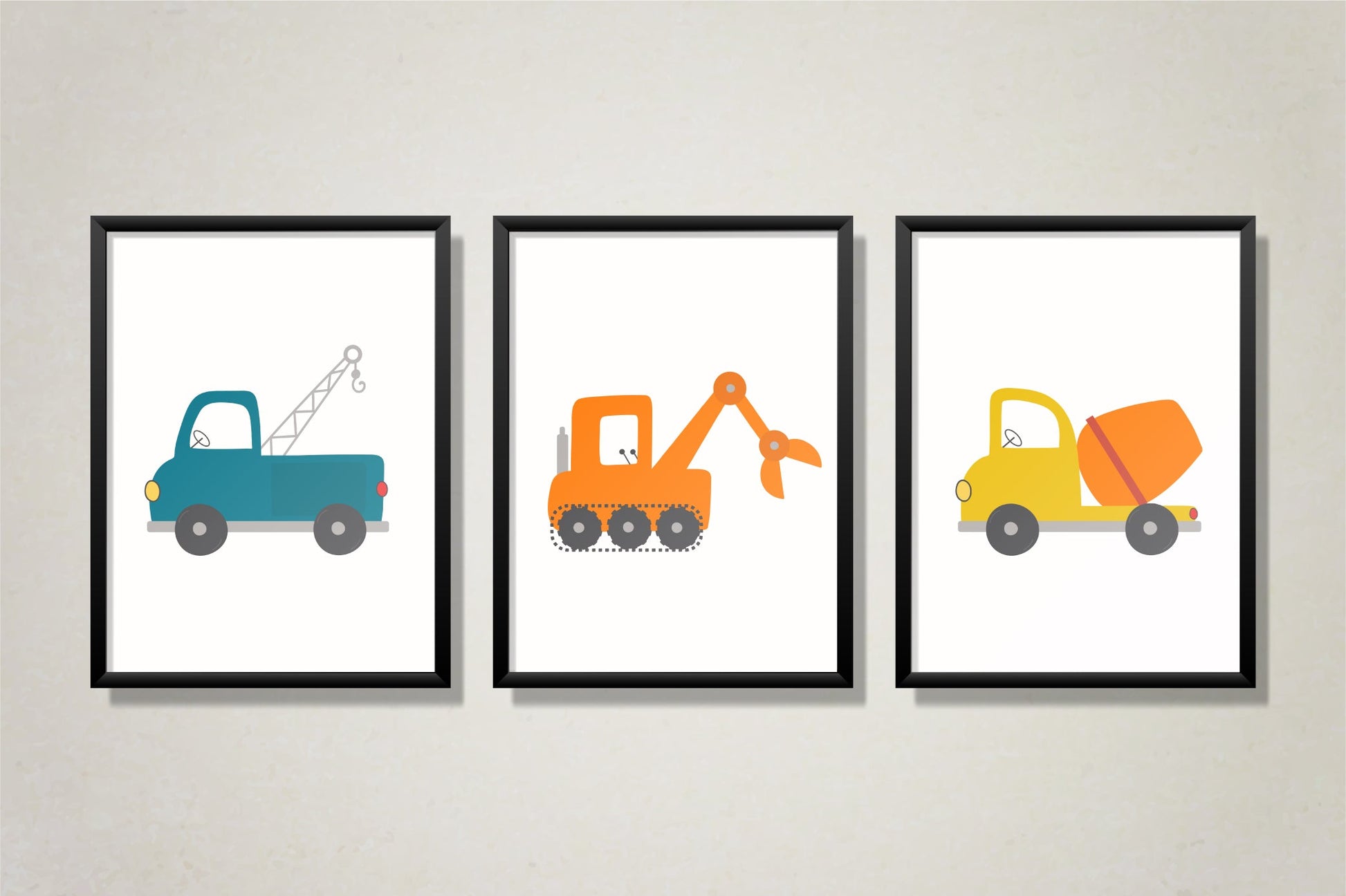 Add that final touch to your child’s room or nursery with one of our bright and whimsical art prints. Available in a large selection of sizes and cute designs which are sure to compliment your child's bedroom or baby's nursery. This set of three art prints features colorful construction trucks.