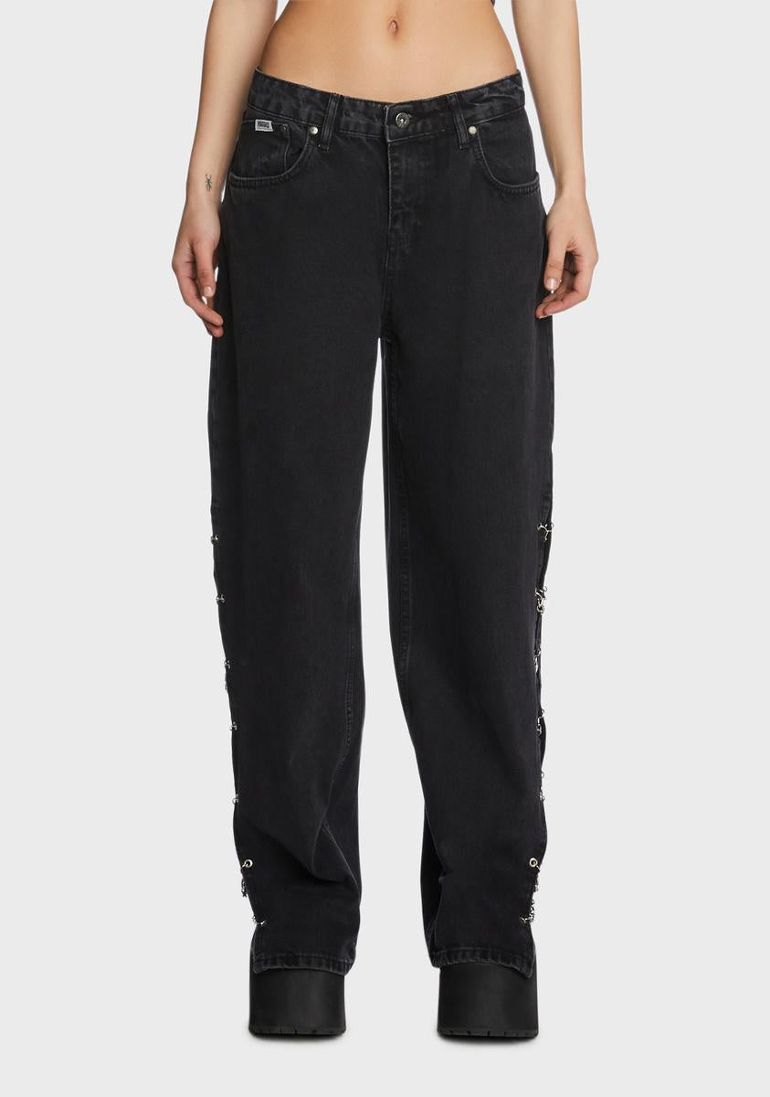 cuz they can't chain you down! These low-rise jeans have a non-stretch rigid denim construction, baggy legs, side slits with chain hardware, classic 5-pocket styling, and a front zip-fly closure.