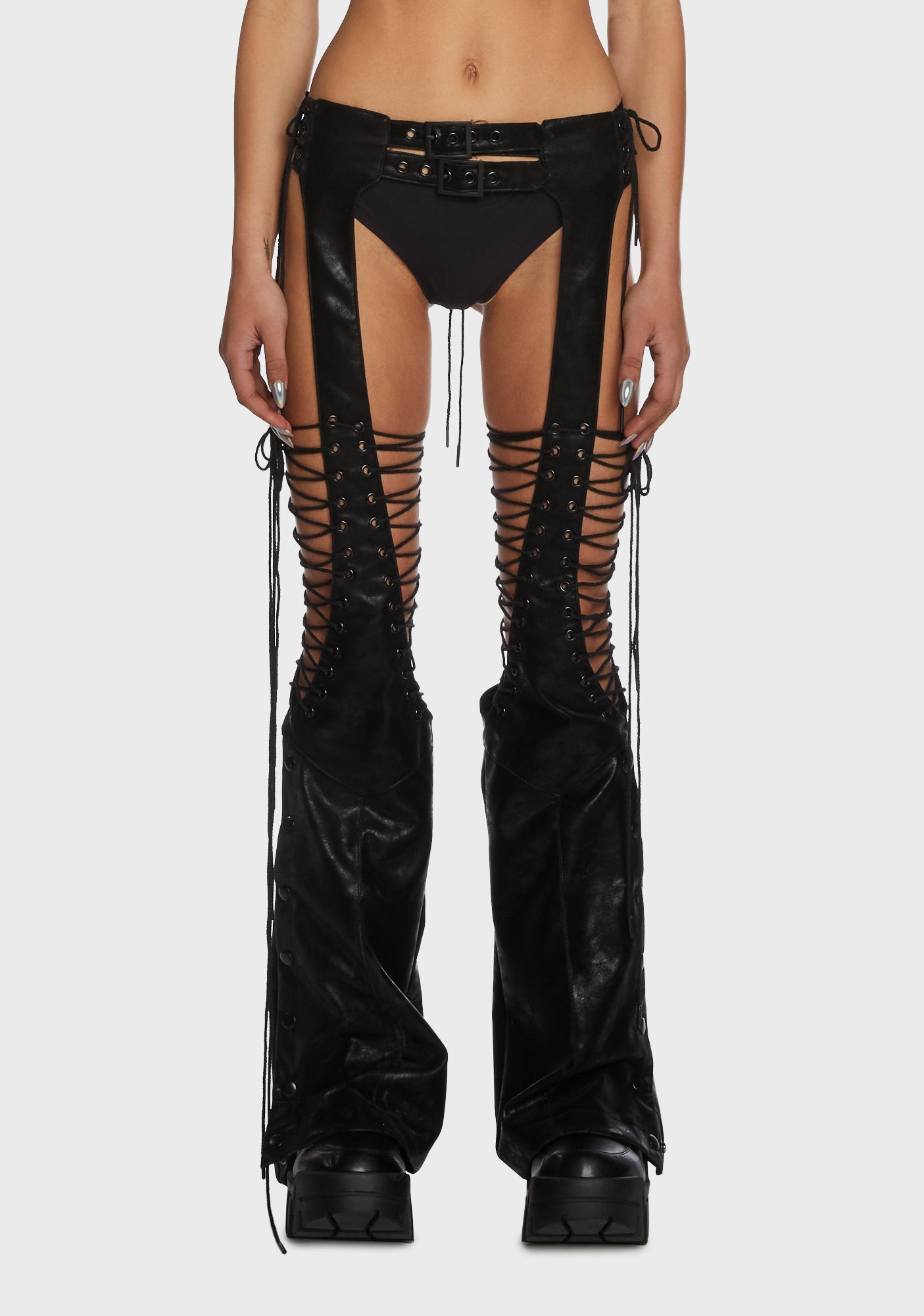 in vegan leather construction with a flared leg silhouette. Double buckle strap closures on front, adjustable lace-up designs all over, embroidered 'D' logo on back, and snap button hardware detailing.