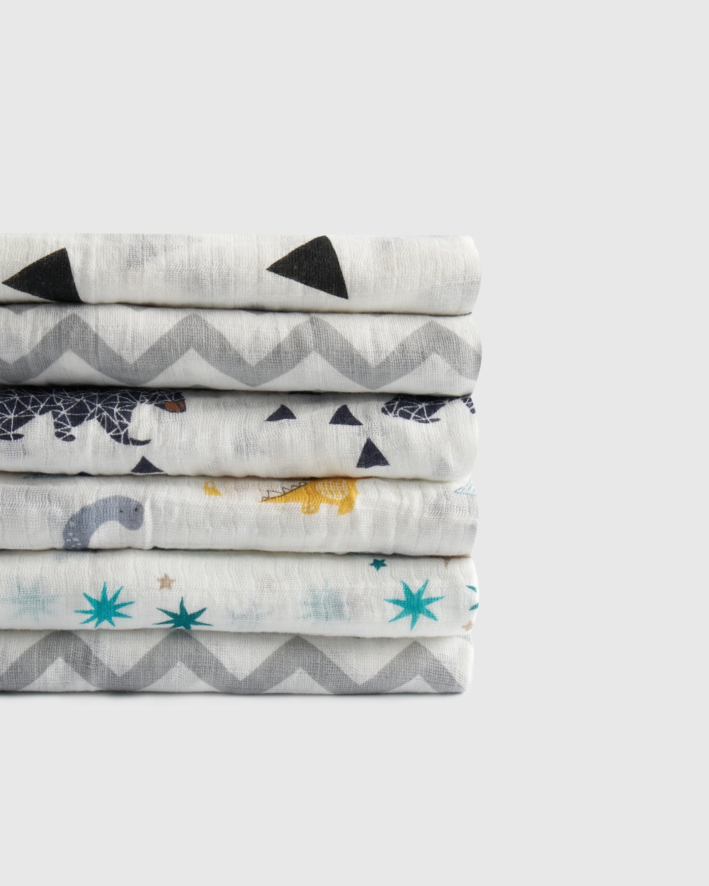 Made of 100% cotton muslin, our soft, breathable, and adorably patterned swaddles will be your go-to baby basic for whatever the day brings �?from tummy-time blanket, to on-the-go diaper-changing surface, to nursing cover-up and more. Our pack of 6 means you’ll always have one on hand.