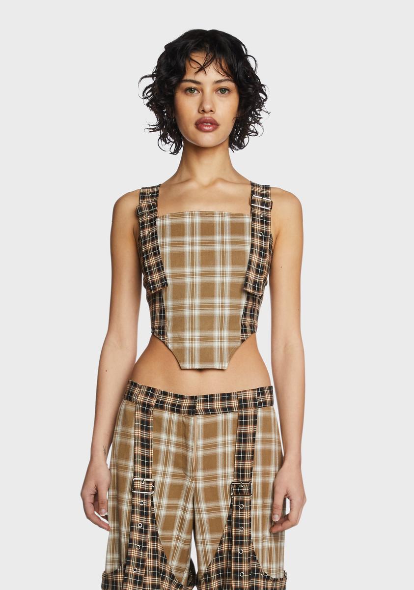 cuz you're icon status. This corset top comes in a cropped fit, with adjustable buckle shoulder straps, a back zip closure, and plaid print all over.