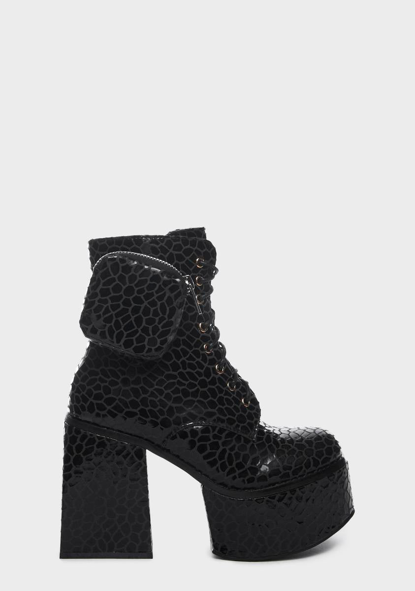 cuz they wanna know what's going on. These ankle boots have a vegan leather construction, front lace up closures, small zipper pouches, contrast trim, and platform soles.