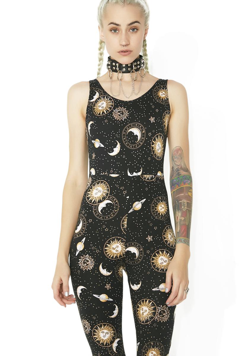 will read yr fortune for ya, babe. This gorgeous sleeveless jumpsuit features a soft ������N stretchy black construction, allover solar system ������N starz print, curve grippin������ fit, and deep scoop back.