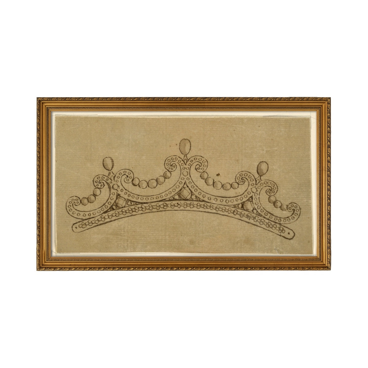 An elegant sketch of a bejeweled crown fit for royalty set amidst a neutral, textured-like background which works to emphasize the graceful details in each pencil stroke. This print can be effortlessly styled in a frame to add that perfect style element to your space.