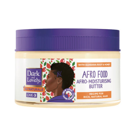 Its formula is expertly infused with Guarana Root, Honey and Coconut Oil to moisturise and reconstruct damaged hair for a supple and shiny finish. The Dark and Lovely Au Naturale Afro Food Afro - Moisturising Butter nourishes and strengthens hair. Hair feels nourished and supple without build-up or greasy transfer.