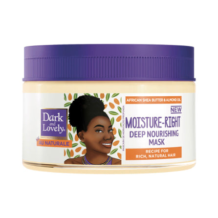 Dark and Lovely Au Naturale Moisture Right Deep Nourishing Mask moisturises, conditions and revives dry damaged natural hair. Its formula is expertly infused with African Shea Butter and Almond Oil to intensely nourish and repair hair for a soft and shiny finish.
