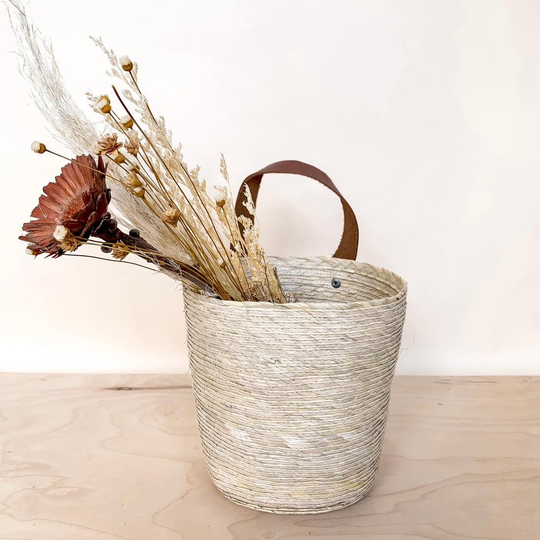 Shaped like a small bucket, the DelSol is lightweight, small, and sturdy. With a naturally tanned, leather strap, it mounts easily on a wall. This basket features a double layer of sustainably sourced palm straw braided throughout, by artisans in Guerrero, Mexico. Each handmade basket is unique and may have small imperfections or vary in size and color.
