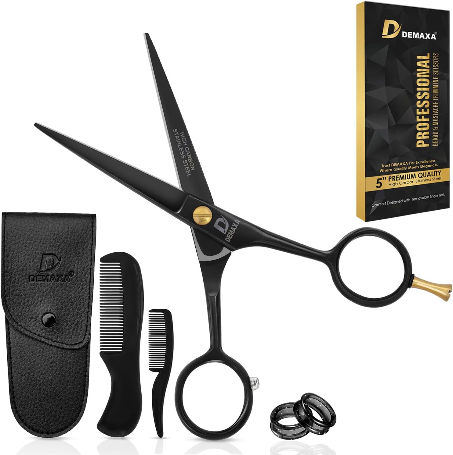 DEMAXA 5" Professional Beard Mustache Scissors with 1 Mustache Comb, 1 Beard Comb & Soft Pouch Ð Prefect Beard Trimming Scissors for All Facial Hair Scissors Ð Grooming Scissors Men (Black)
