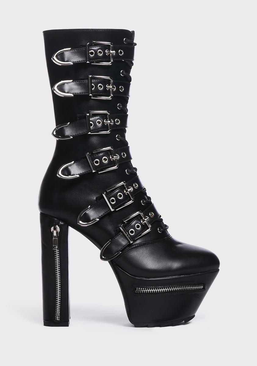 got you lookin' to escape. These boots have a vegan leather construction, buckled grommet straps, front zip closures, and decorative zippers on the platforms and block heels.