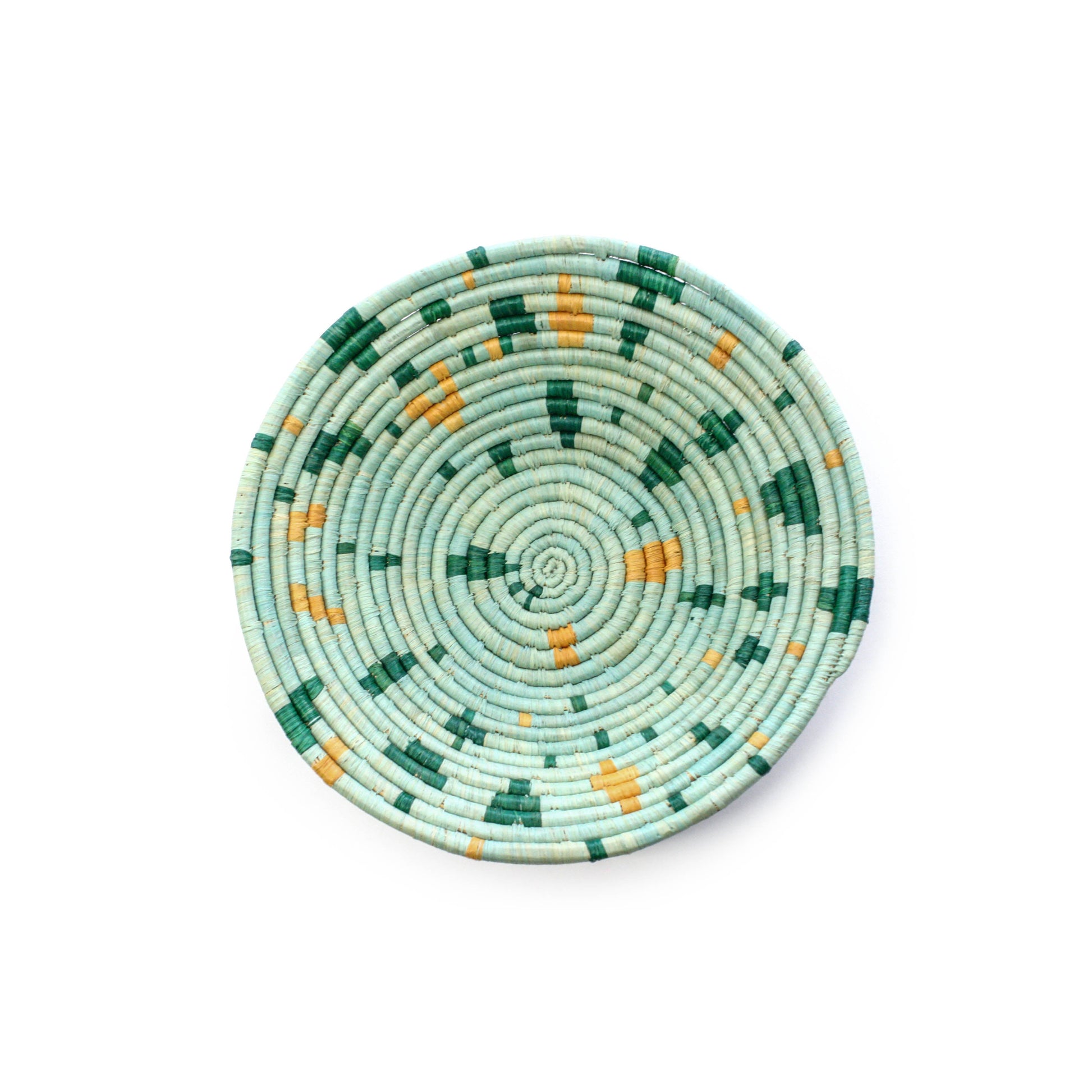 The perfect size for a multitude of uses around the house, this basket also wows with its seemingly random pattern of greens and peach, making it a functional and gorgeous accent on your dining table, on a bookshelf, or used as part of a decorative grouping on a wall. Each piece is handwoven from natural sisal and sweetgrass by the members of a women's fair-trade cooperative in Rwanda and colored with only organic dyes, making it safe for use with food items.