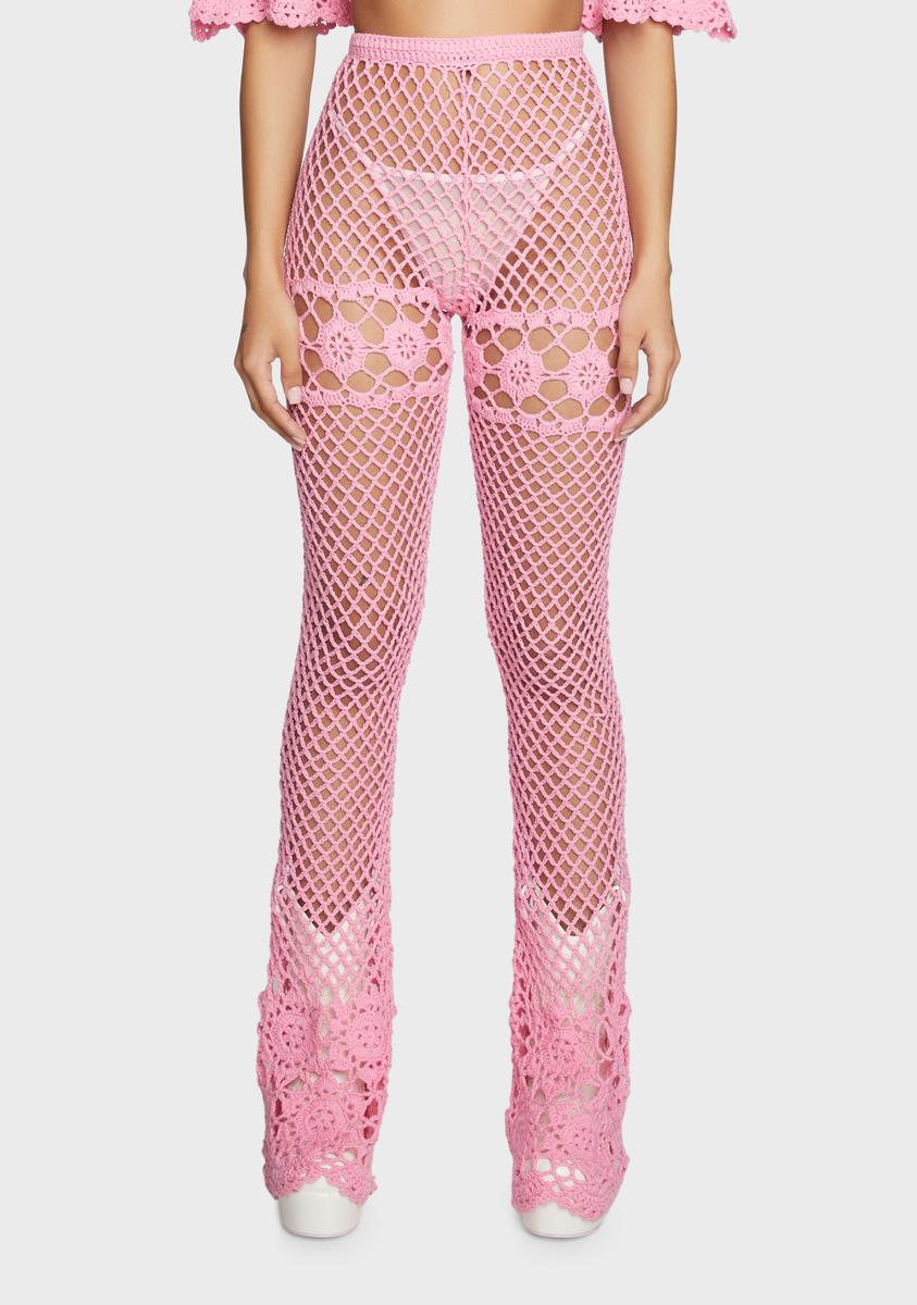 cuz dreaming is free. These bottoms have a sheer crochet construction, an elastic waistband, a high waist fit, and a flared leg silhouette.