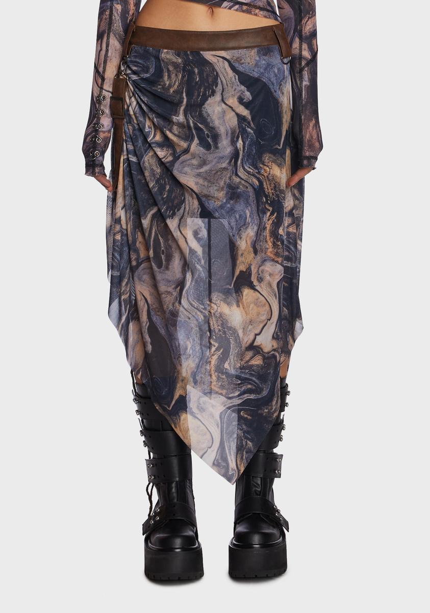 in lightweight semi-sheer fabric with asymmetrical handkerchief hemline and raw cut edges. Ruched side with adjustable drawstrings, contrast vegan leather straps with D-ring hardware and lanyard charm, embroidered logo on back, and a back zip closure