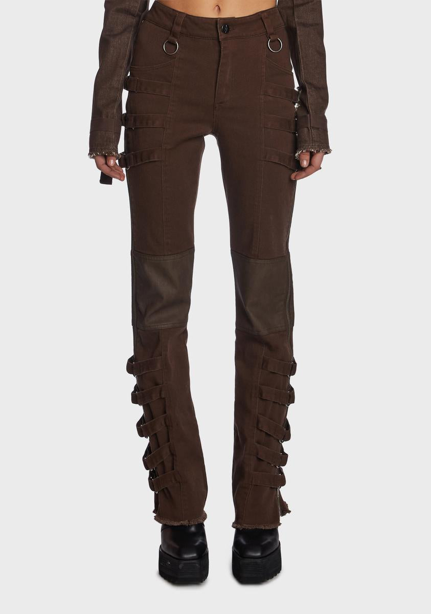 in stretch twill construction with a high-waisted straight leg fit. Belt loops with O-ring hardware, bondage straps with snap button and O-ring hardware, front zip-fly closure with a logo-embossed button, side pockets, vegan leather panels at the knees, and side zip closures from hip to raw edge hem.