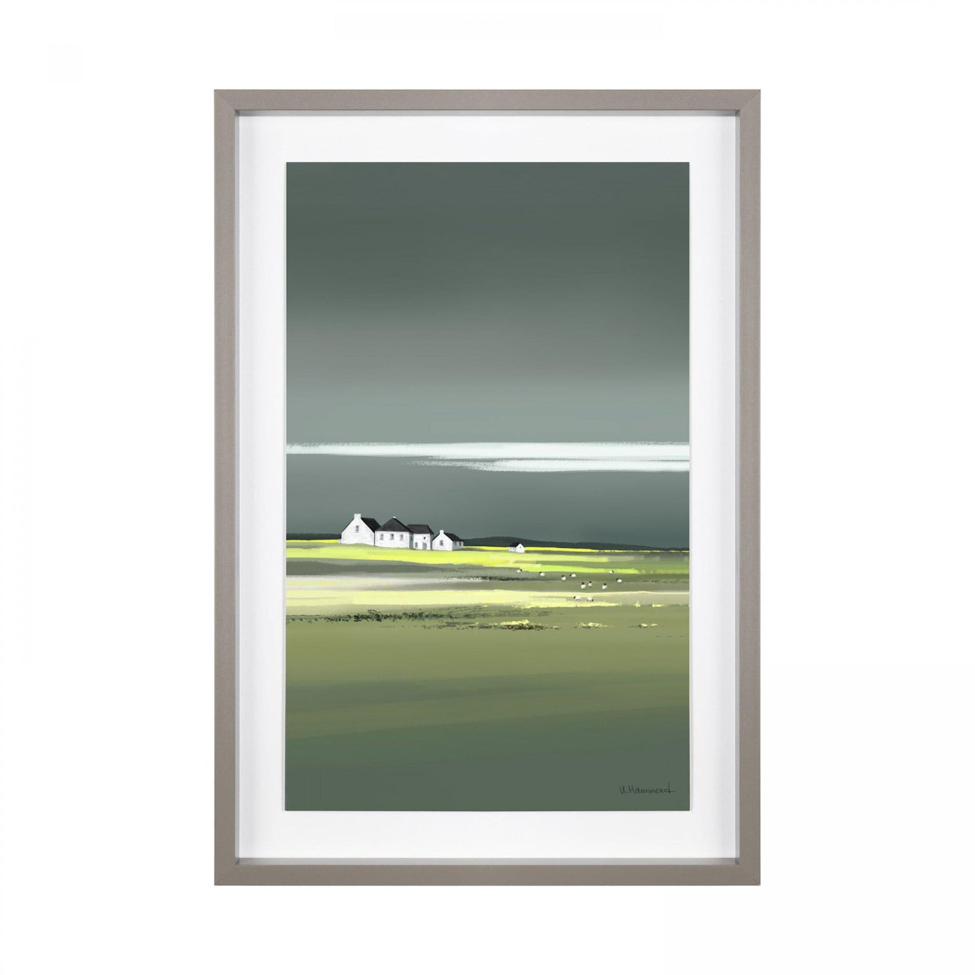 Ulyana Hammonds palette of gun-metal grey and grasshopper green throws a lone group of whitewashed cottages and a speckling of seagulls into sharp contrast. Meanwhile, her deft used of raised image and colour creates a powerful sense of depth and distance. Raised image, framed and glazed.