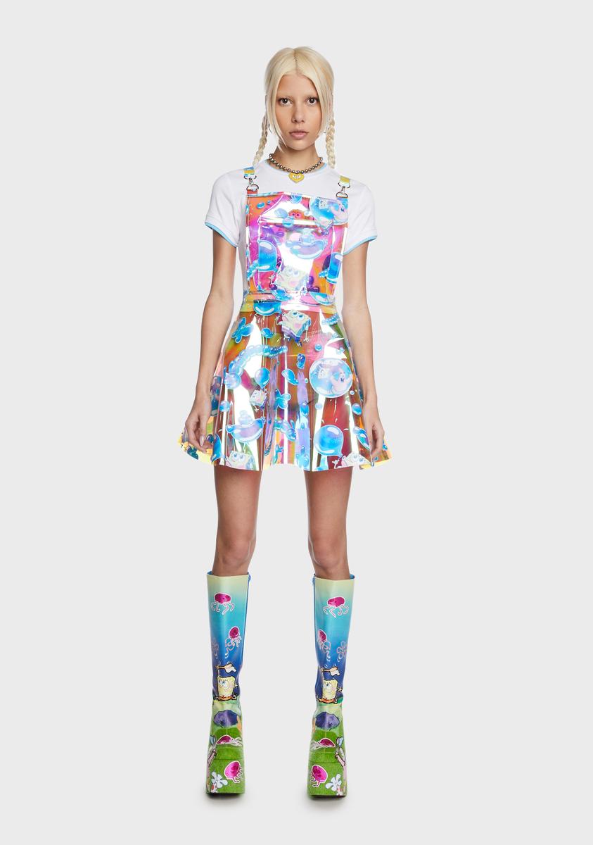 cuz we're in this together. This dress comes in a holographic vinyl construction, with adjustable shoulder straps, clasp closures, front patch pockets, a back zip closure, and a Spongebob and Patrick bubble print all over.