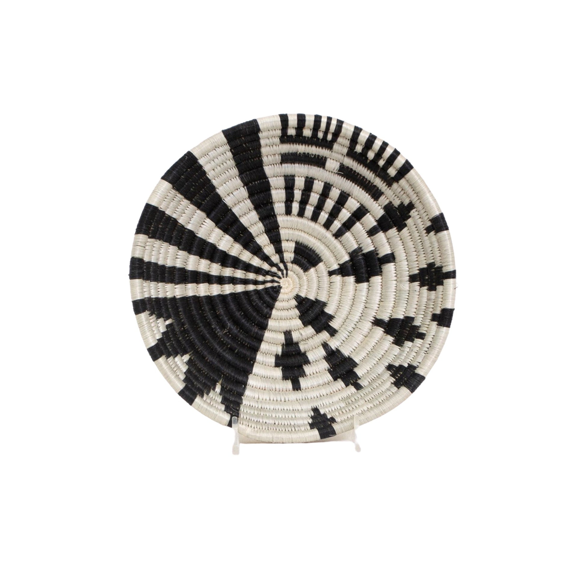 Black and white deliver not one, not two, but three striking patterns on this round basket. In sisal and sweetgrass, a large-scale fan pattern breaks into thinner stripes and bits and pieces of black.