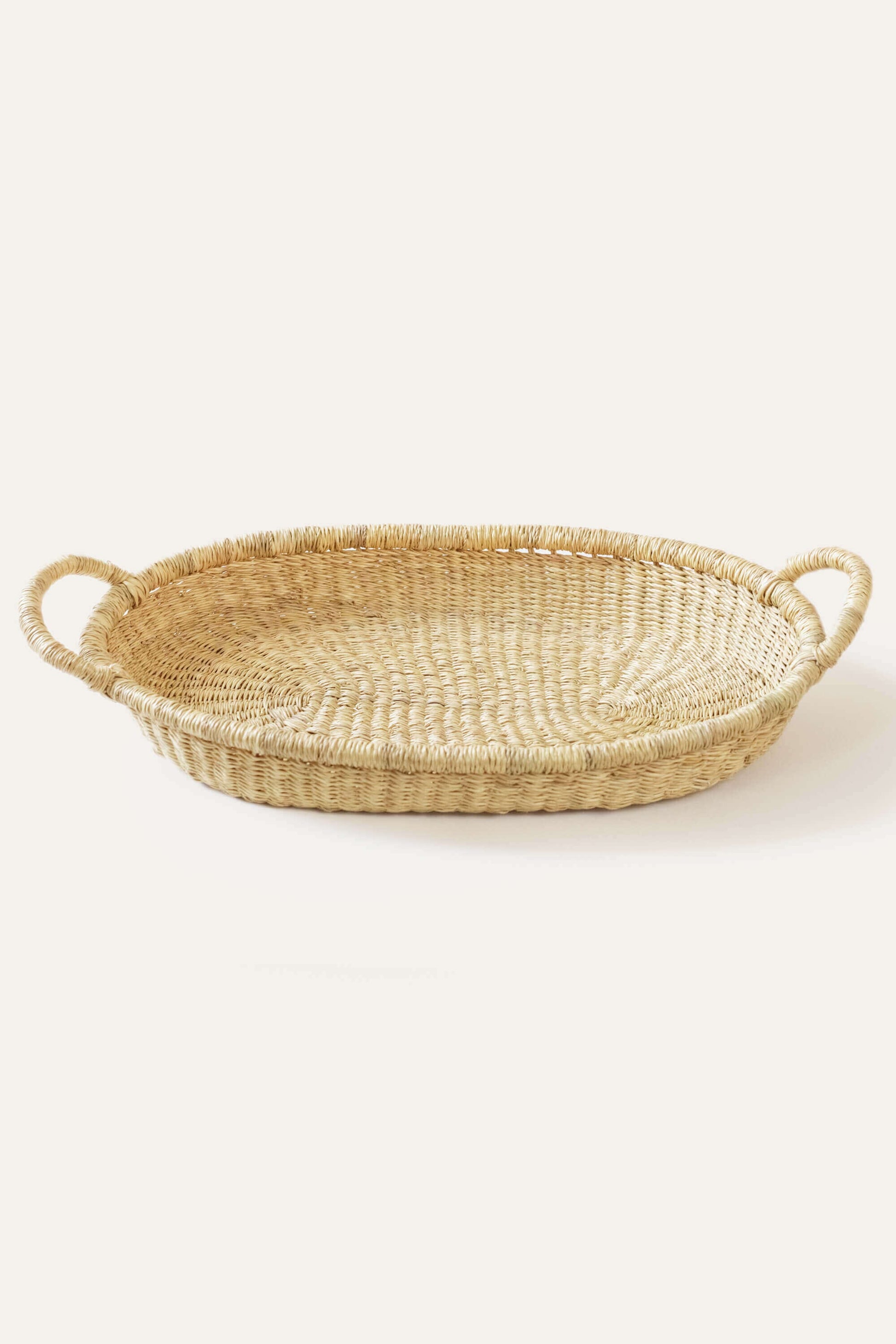 Style your tabletop with the Bolga Double Handle Oval Tray! Handmade in Ghana, this multifunctional tray is lightweight and flexible and features two sturdy handles. Durable, lightweight, and handmade with heart, this tray is the perfect size for a statement in any space!