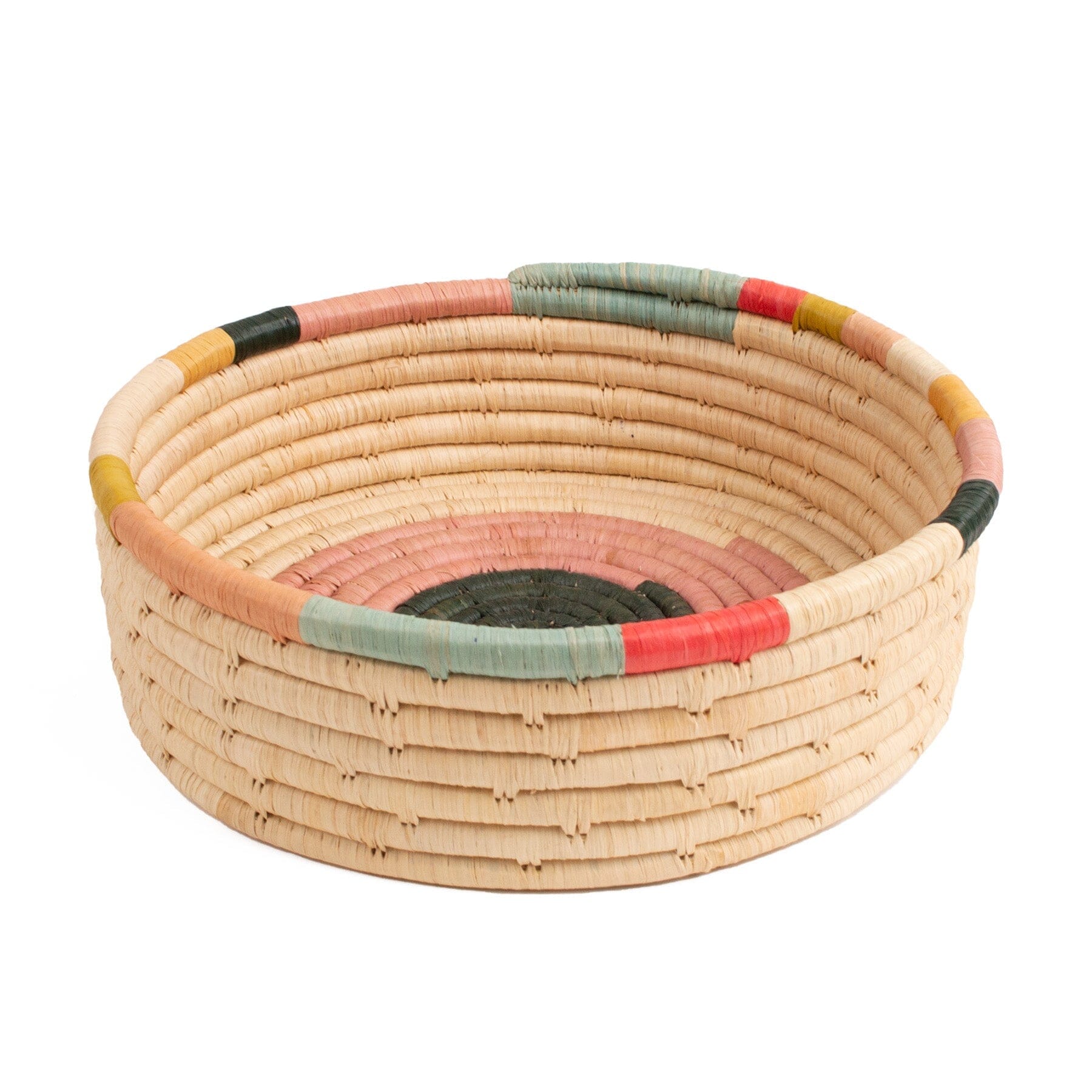 Expertly-woven with tropical hues, this tray will bring joy to meal services, gatherings, and items on the shelf too. The wonder and delight of concise circles accented with potent color creates a unique adaptation of traditional serving-ware in this handmade piece. With its one-of-a-kind look, this piece shines at meal service, as wall décor, staging other pieces on the shelf, or as a catchall for frequently used items.