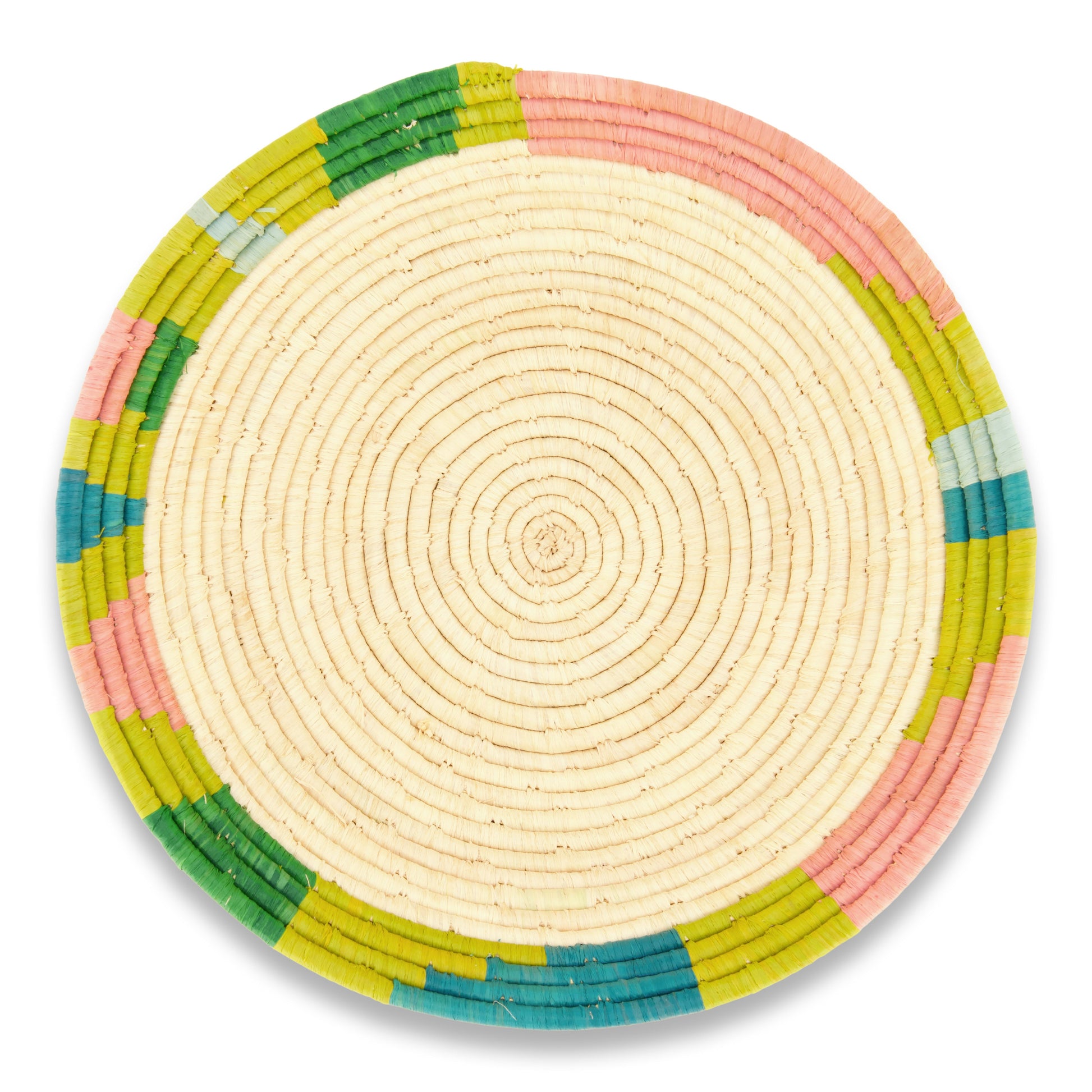 Shapely and bright, this expertly woven bowl enlivens any space while holding fruit, tabletop goods, or delighting the senses on the shelf or wall. Tight coils and expert stitching give neutral design tropical artisan charm, and its uses are endless. Set this woven wonder alone, put it to work as a display in any room, or pair with additional textured wares to vibrantly transform your space. Each piece has hand-stitched hang loops on the back that allow for easy hanging in several orientations.