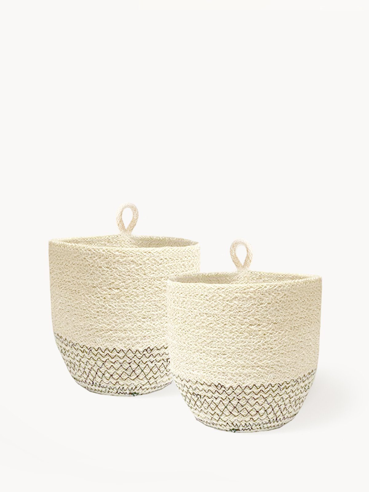 The Amari Loop Bin Set is ready to hang, try it with flowers for a hanging garden, or for extra kitchen or bathroom storage. Each set is made with ethically sourced, natural materials and handwoven in a fair trade environment. Variation is celebrated with handcrafted products.
