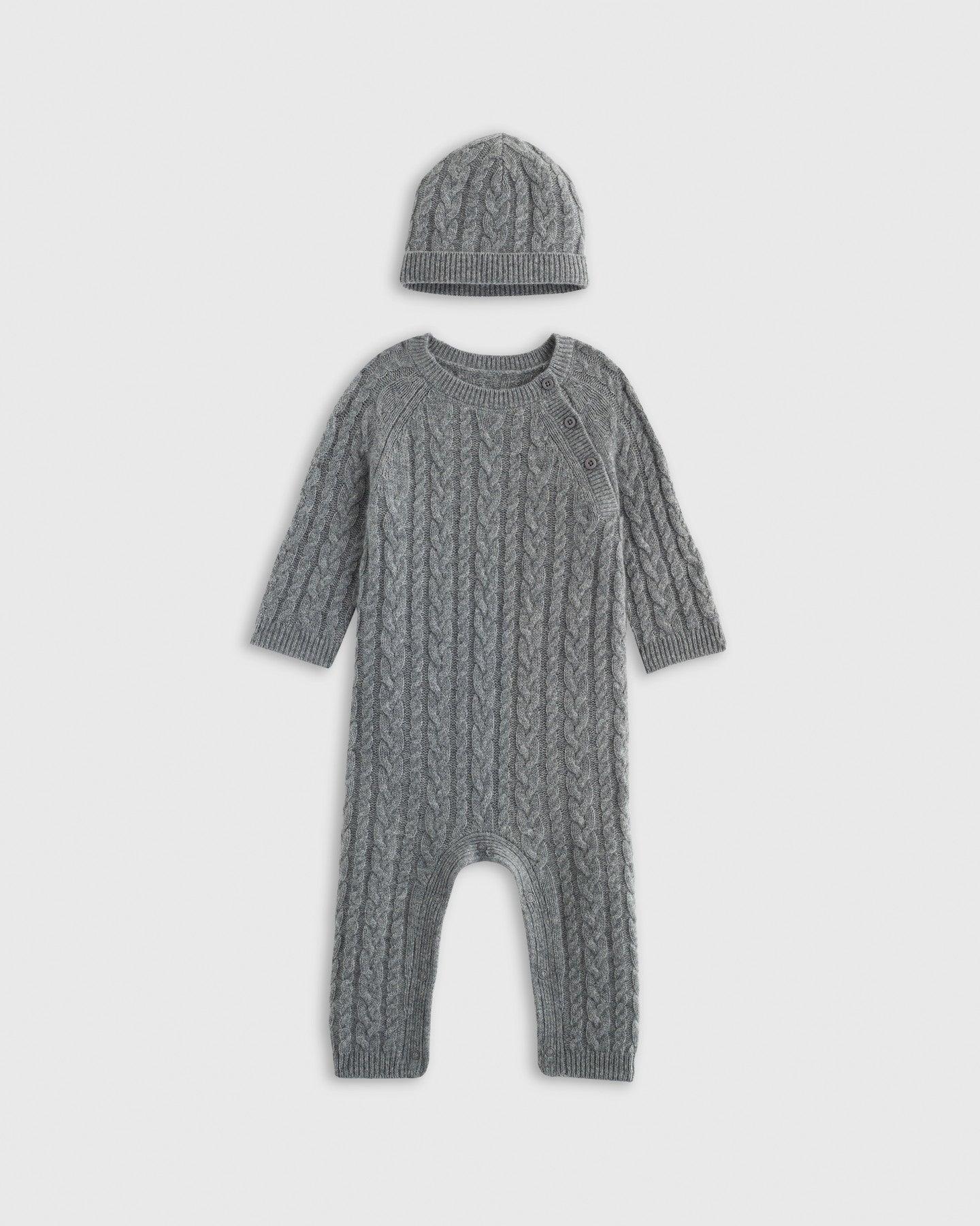 This cable knit one piece and hat set is not just an indulgent gift, but a practical one as well. Our all-natural cashmere has a cloud-like softness, meaning it won’t irritate your little one’s delicate skin. It is lightweight and breathable, so it will keep them warm without the risk of overheating. Due to its natural antibacterial qualities, it requires less frequent washing, and no dry cleaning is required.