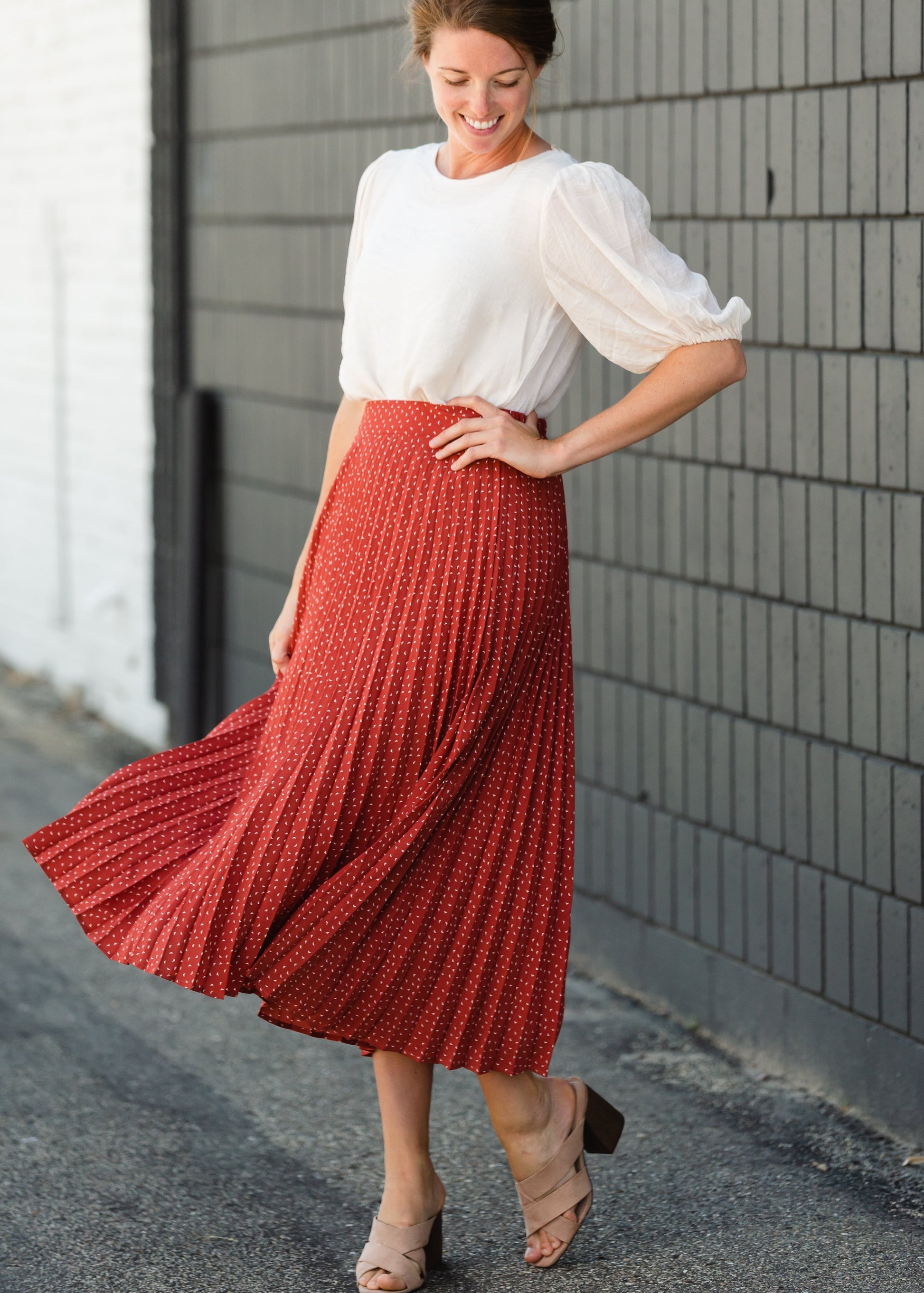 It's clear to us that you need?love flowy midi?skirts, so go ahead and add it to your cart! This Brick Pleated Abstract Midi Skirt has a solid brick red color?you can dress up or down for every occasion! The gentle, abstract design is so pretty too! It's comfortable for all day wear, has a flowy fit, and features the cutest pleated overlay for the ultimate look! Style this skirt with a basic top and sandals for an effortlessly?feminine look!?