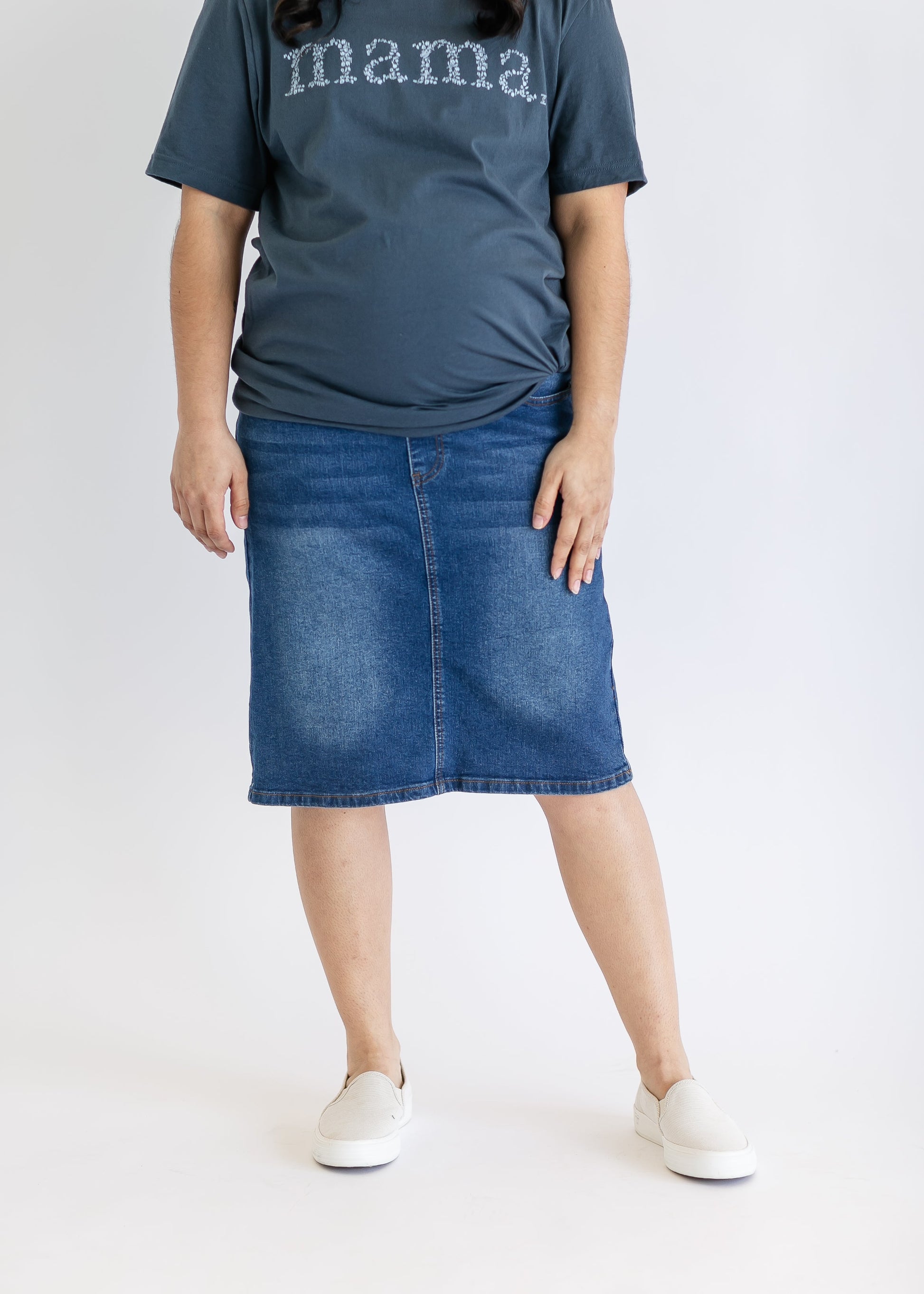 An Inherit Design, the Remi?Maternity Denim Midi Skirt is cut with a modest and classic straight fit! This denim midi skirt will be ago-to time and time again for any occasion. With a wide belly band and a little bit of stretch in the back, you'll be able to wear this as your belly grows. This new and updated?skirt?adds a feminine style to your closet without any thought at being dressy or casual as it is definitely both! This skirt has awesome stretch for total comfort and no back slit while still allowing for unconstrained walking! This design cater to different heights, we are thrilled to offer BOTH 26" and 29" lengths to accommodate!