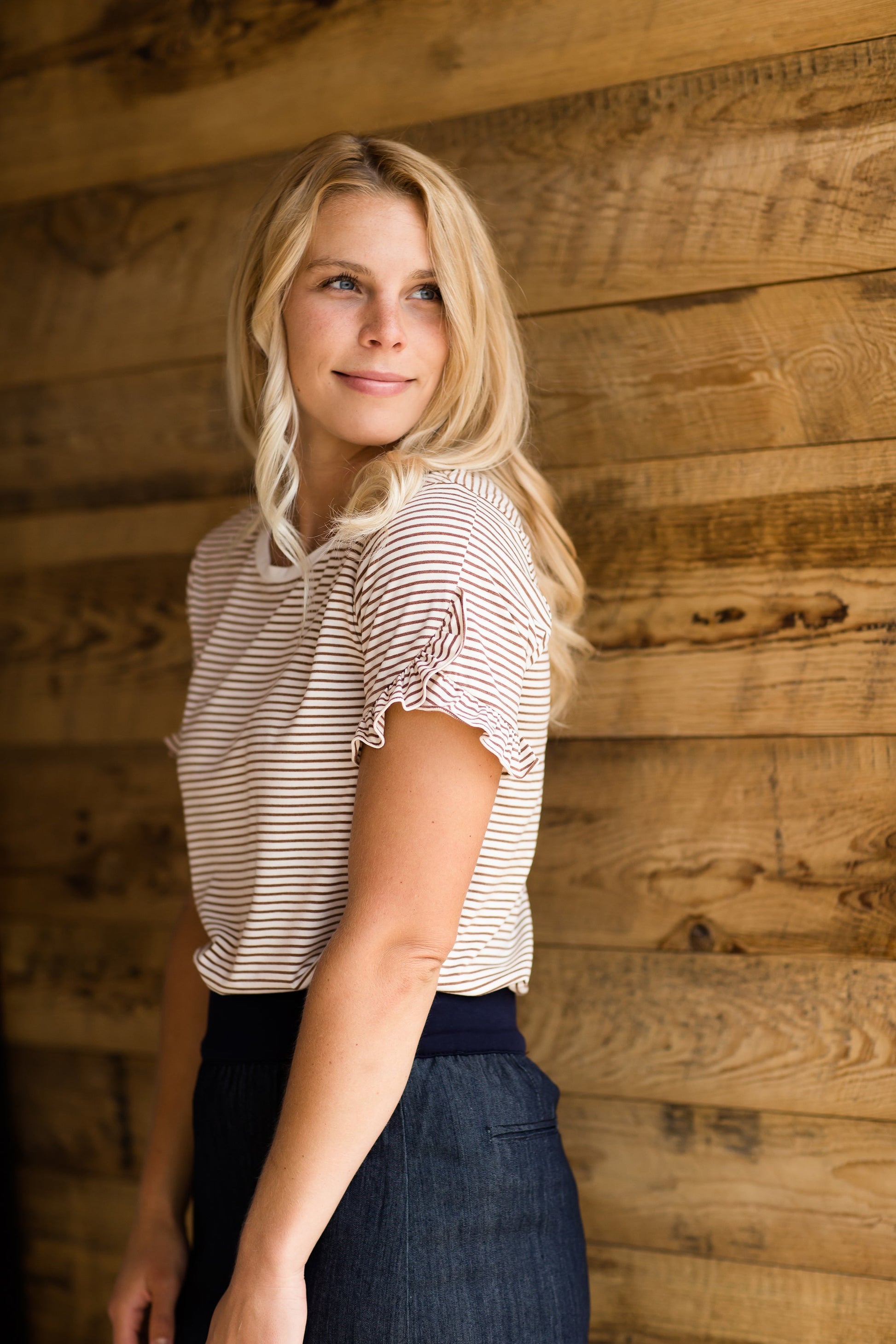 The Ruffle Sleeve Striped Top will become your new go-to shirt! The ruffle sleeve and cream neckline detail adds a touch of elegance?that allows you to dress the shirt up or down! Pair this effortless top with your favorite modest midi or maxi skirt to make it unique to your style!?