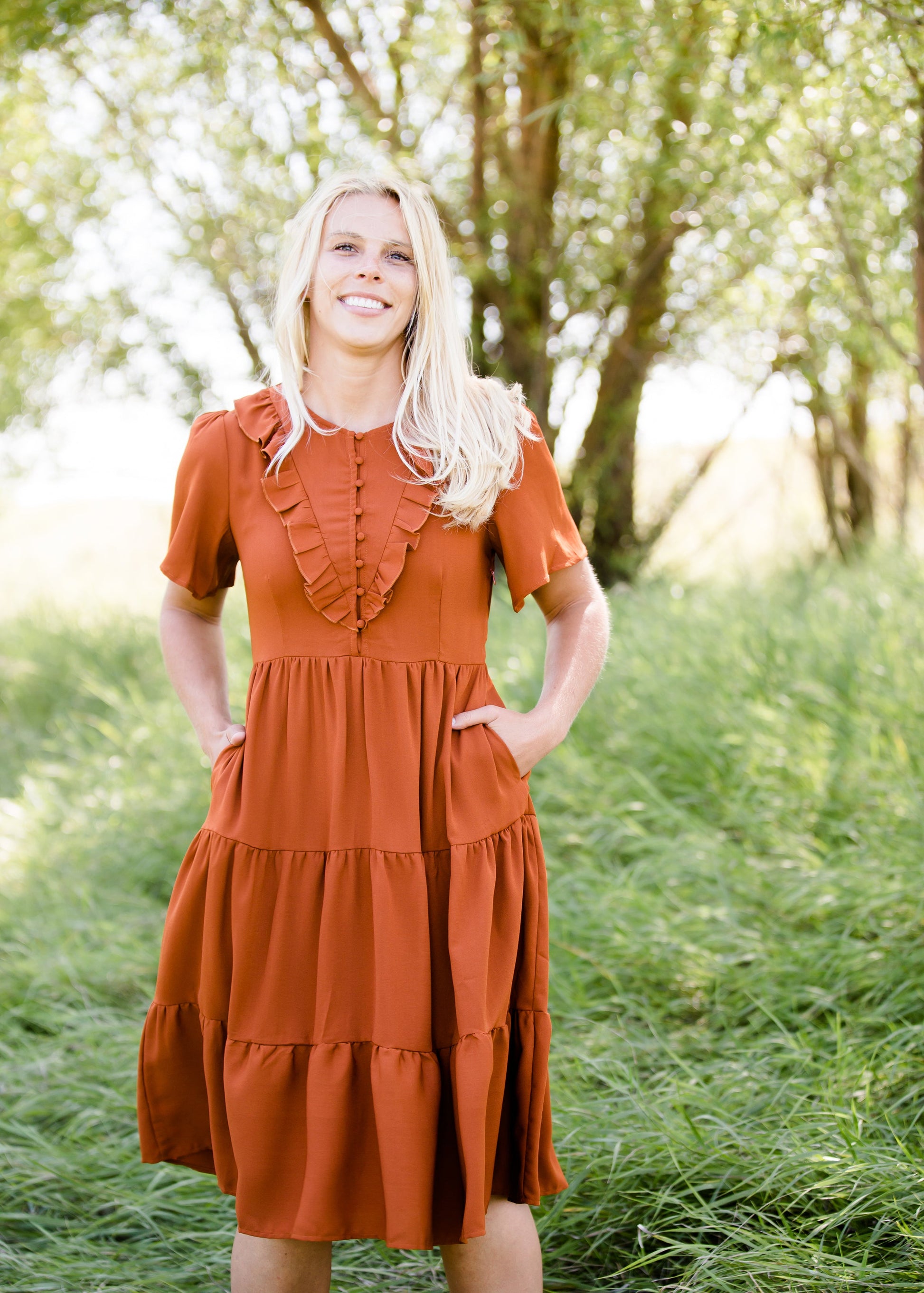 ?Sugar and spice and everything nice, that's what this modest Ruffle Tiered Flowy Midi Dress is made of! From the light weight fabric to the ruffle detail that lines this dress, it is one of our fall favorites! Paired with your favorite cardigans or just alone, you can style this any way you please.