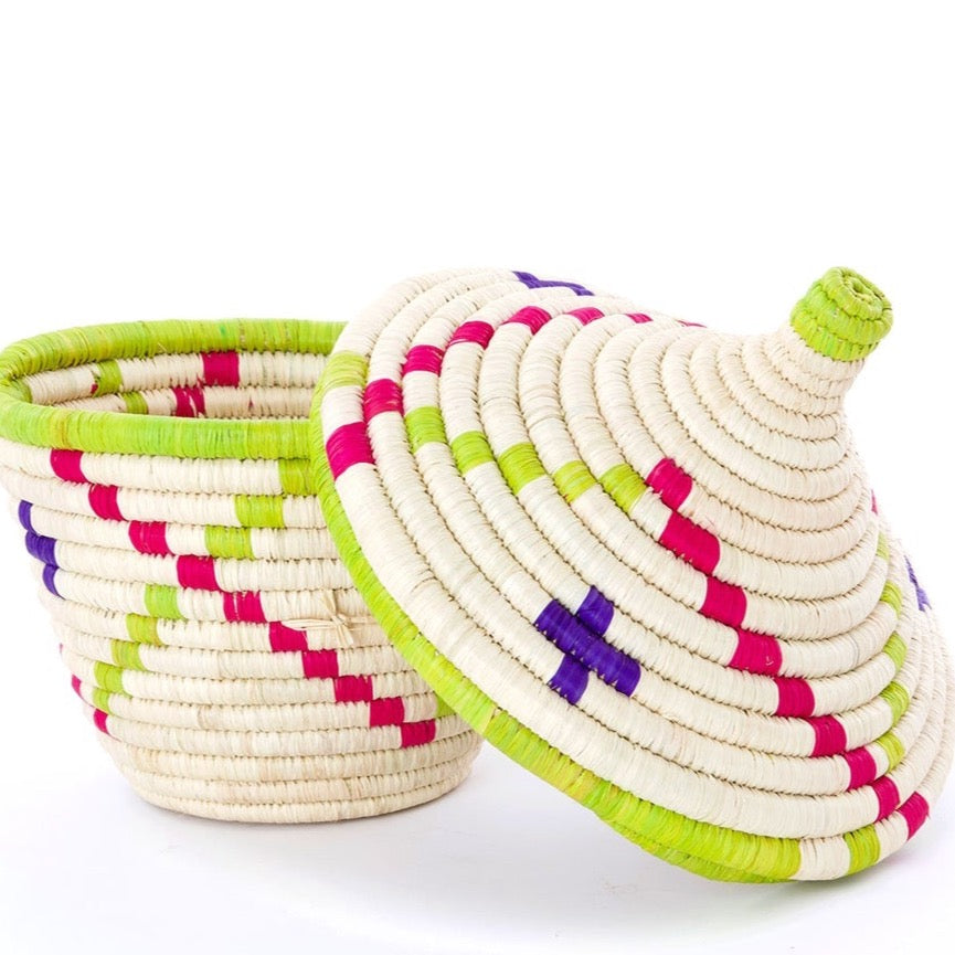 Skilled weavers living in the ethereal Rwenzori Mountains of Uganda fashion this amply sized lidded basket from dried banana leaf or papyrus stalks and dyed raffia. When used to present gifts or baked goods, this beautiful basket becomes a treasured possession.