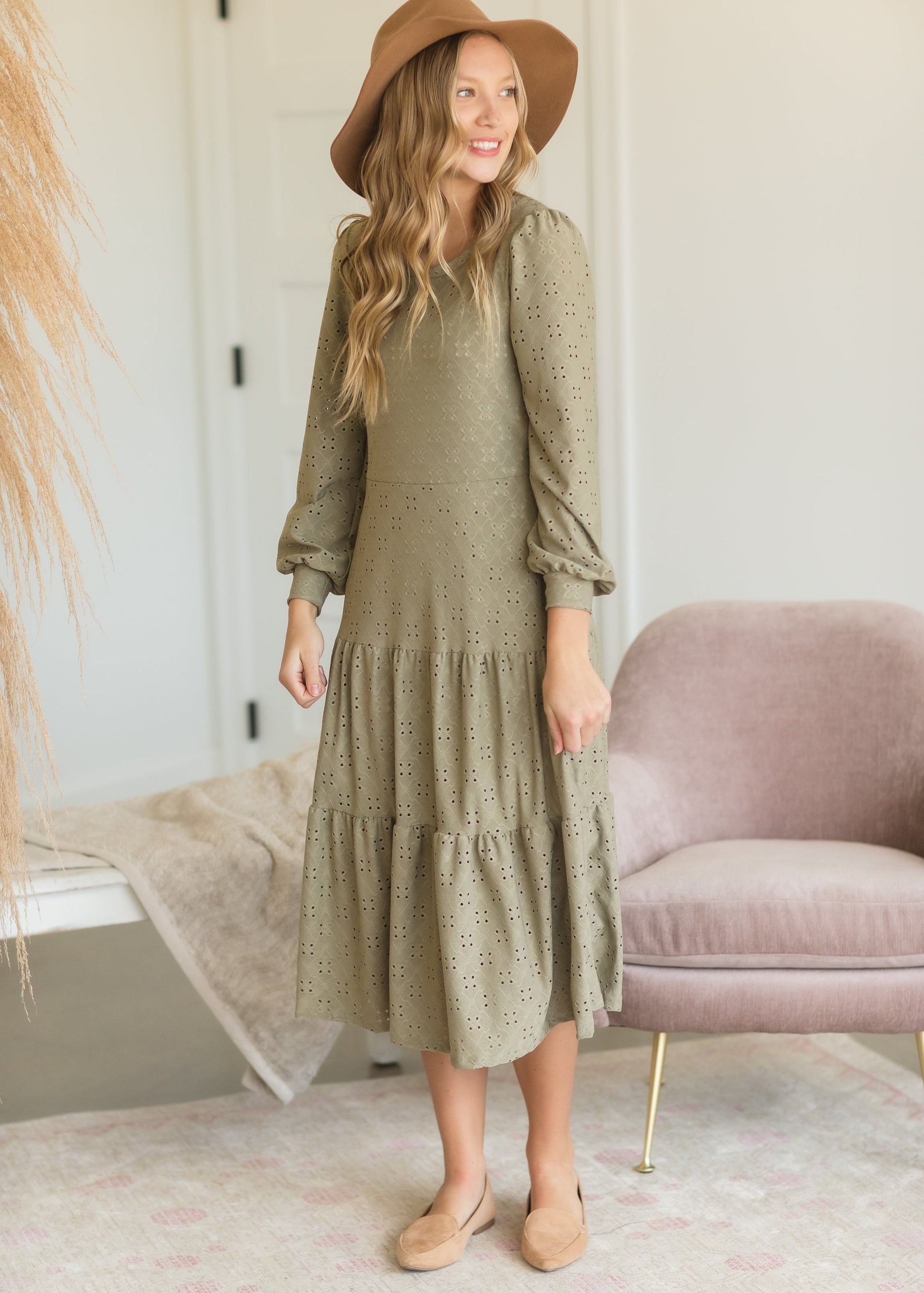 We can't decide what we like most about this?feminine Sage Eyelet Knit?Midi Dress, the?eyelet design, the fact that it is lined, or how the sleeves balloon out a bit at the wrist! This sage, eyelet midi dress is the perfect neutral style to pair with your?taupe shoots and?panama?style hats for a boho-chic look!