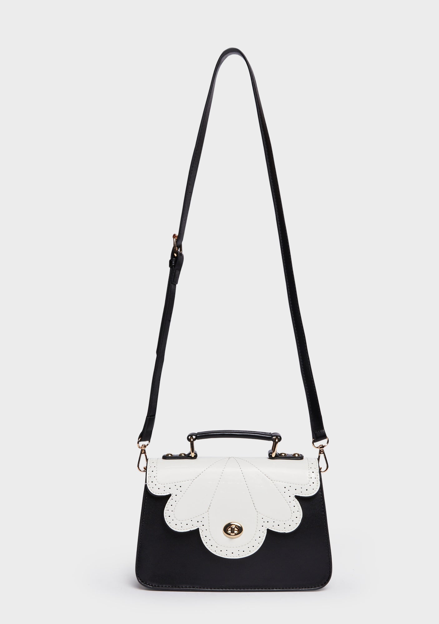 cuz your money is good here. This handbag has a vegan leather construction, a scalloped top flap with perforated details, a top handle, a front zipper closure, and a kiss lock closure.