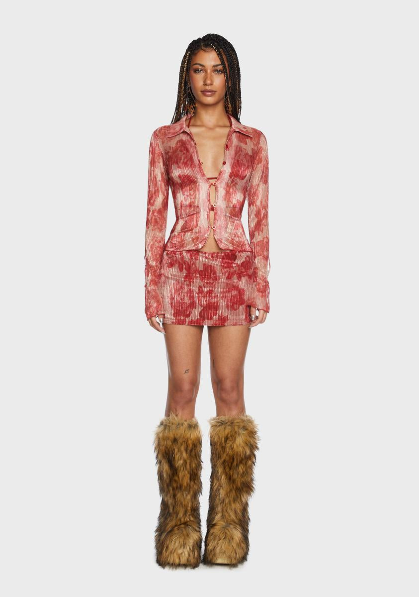cuz be insta worthy! This skirt set includes a triangle bra top with halter neckline, a long sleeve top that has a shimmery ribbed construction, an all over rose print, a collared neckline, lettuce trim button cuffs, button front closures, and a mat