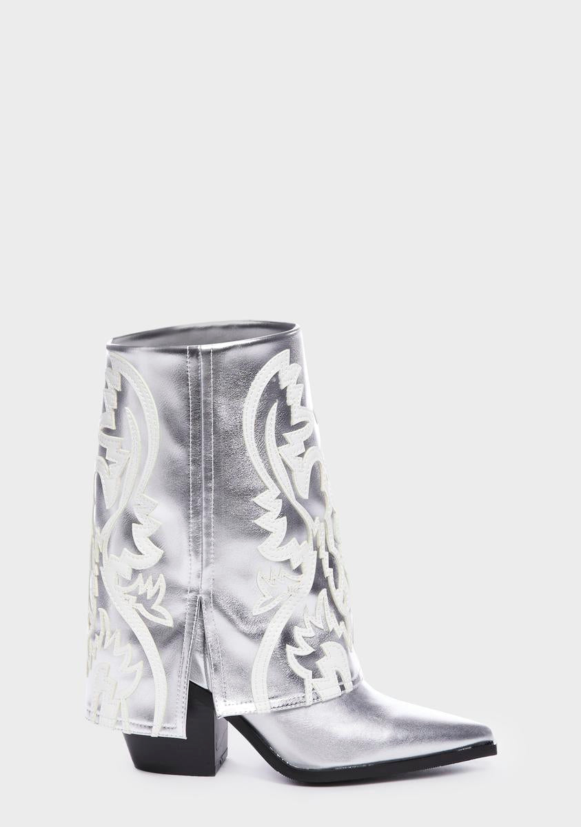 cuz you're on a roll. These mid-calf boots have a metallic vegan leather construction, contrast-colored western inlays, foldover shafts, pointed toes, split hems, and stacked block heels.