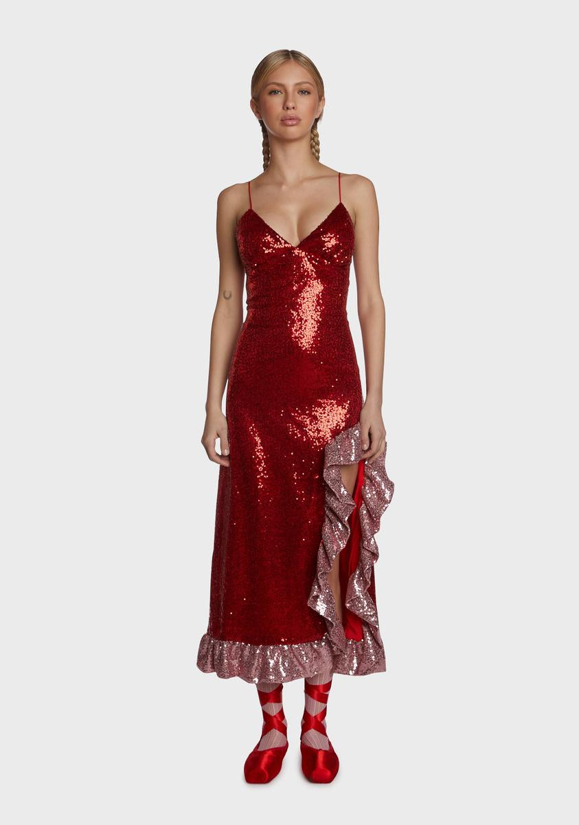 your time to shine. This midi dress comes in a sequin construction, with a leg slit, contrasting sequin ruffle details, spaghetti straps, and a v-neck.