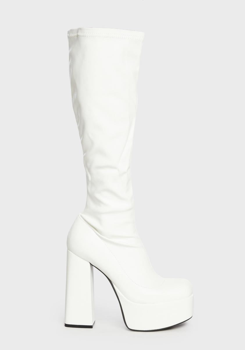 cuz you want it, you got it. These knee high boots have a vegan leather construction, platform soles, block heels, and side zipper closures.
