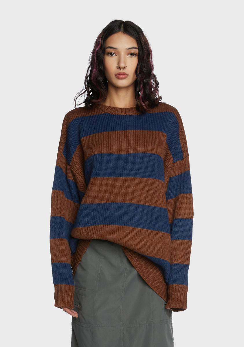 cuz it's not your problem, babe. This oversized sweater has a knit construction, ribbed trim, a wide striped print all over, and long sleeves.