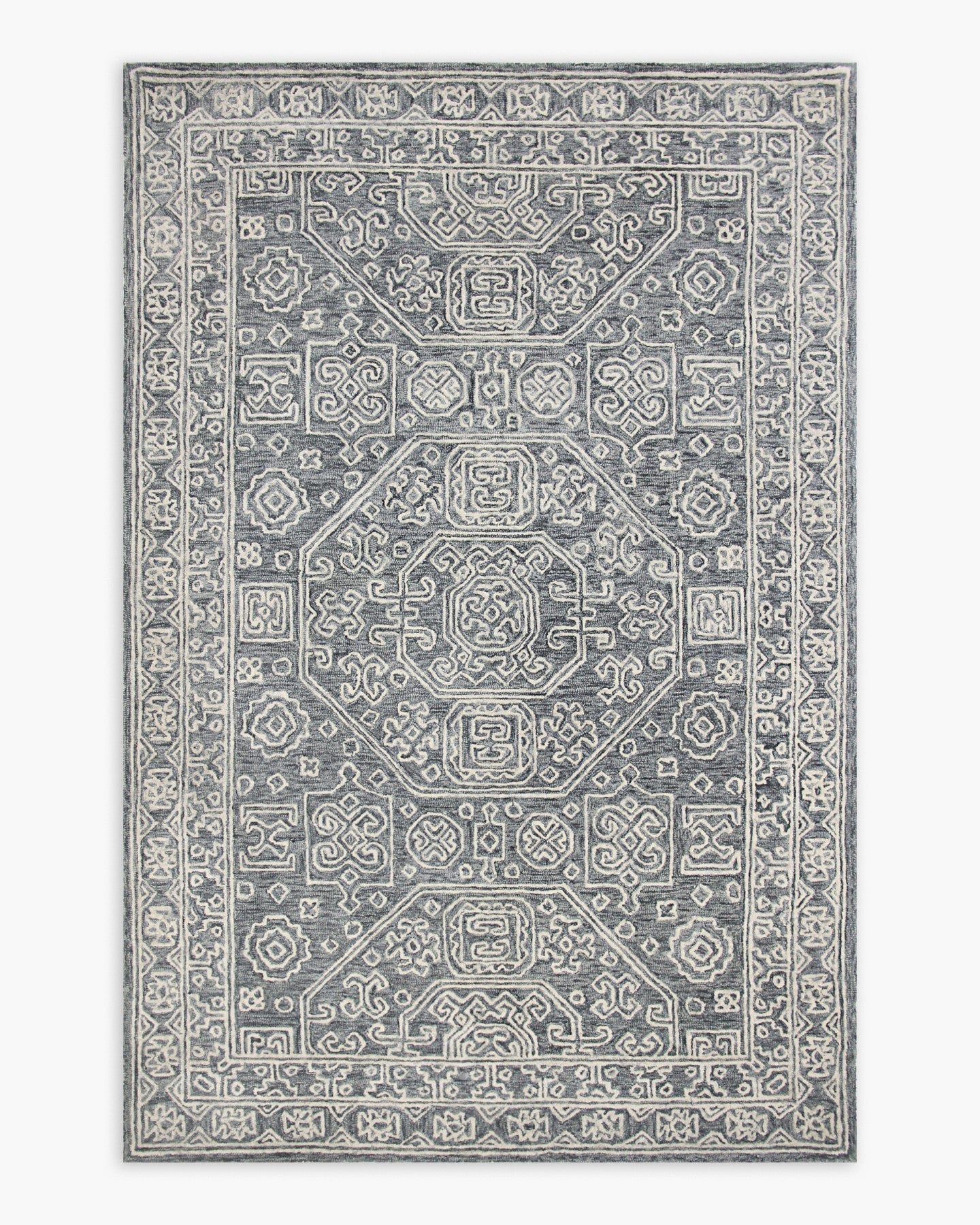 A traditional design in a boldly saturated shade of grey is the standout feature of the Vera Rug. Our rugs are expertly hand-tufted by artisans in India, making each rug inherently unique. The wool yarns used in our rugs are soft yet strong, making them both comfortable and durable.
