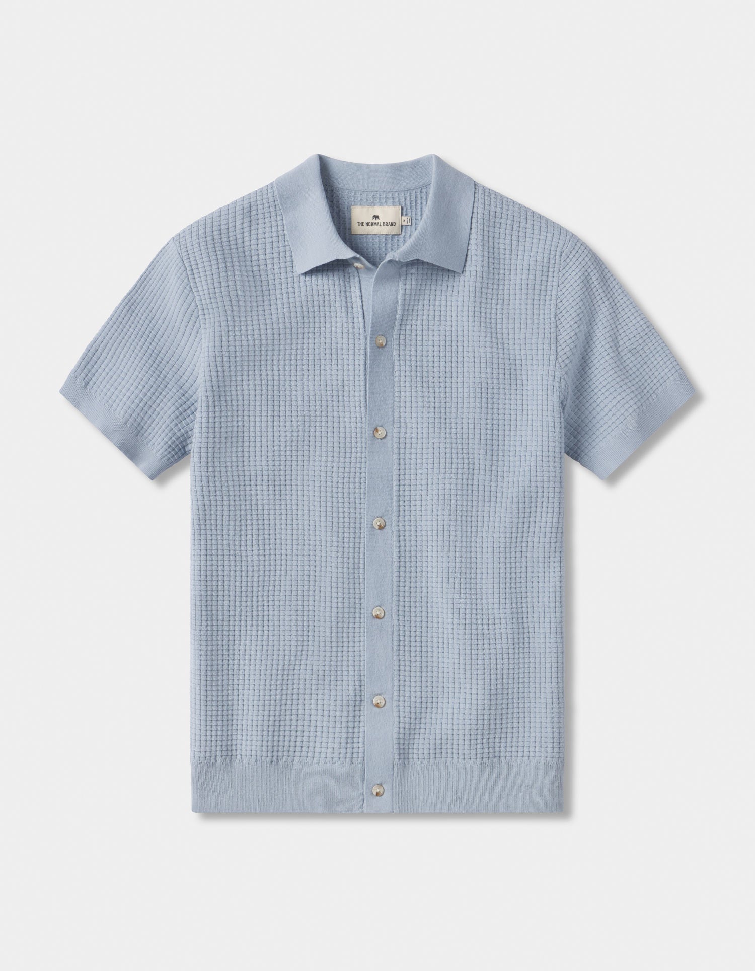 Relaxed and airy. Crafted from a waffle sweater knit, this shirt offers a textured and lightweight feel, ensuring optimal breathability for all-day comfort. The rib collar, button placket, sleeve cuffs, and bottom band add visual texture and dimension, creating a stylish yet relaxed look. It's soft and stretchy for ultimate comfort, and features faux horn buttons for an elevated casual look