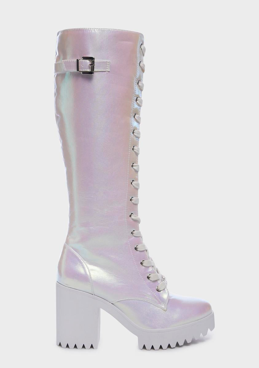 cuz you're pure magic! These knee-high boots have an iridescent construction, adjustable front lace-up ties, side zip closures, buckled belt trim, tread outsoles, and block heels.
